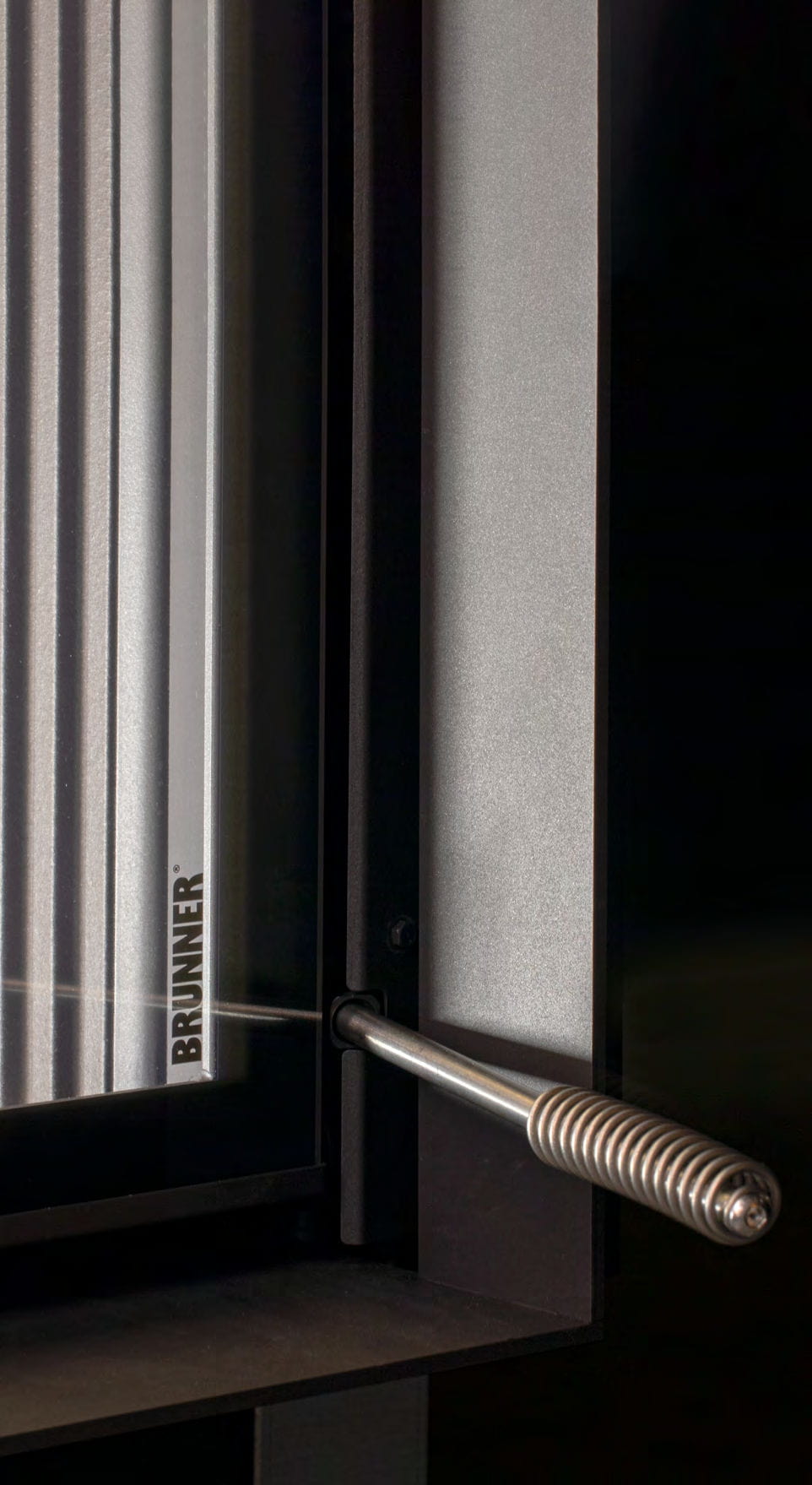В топках Brunner устанавливается система "Puzzle": устойчивый к изгибу и кручению профиль дверцы. С внешней стороны предусмотрены специальные каналы для керамического стекла и уплотнительного шнура. Шнур представляет собой гибкий шланг, способный выдержать высокую температуру (до 750° C) с пружинным металлическим сердечником.