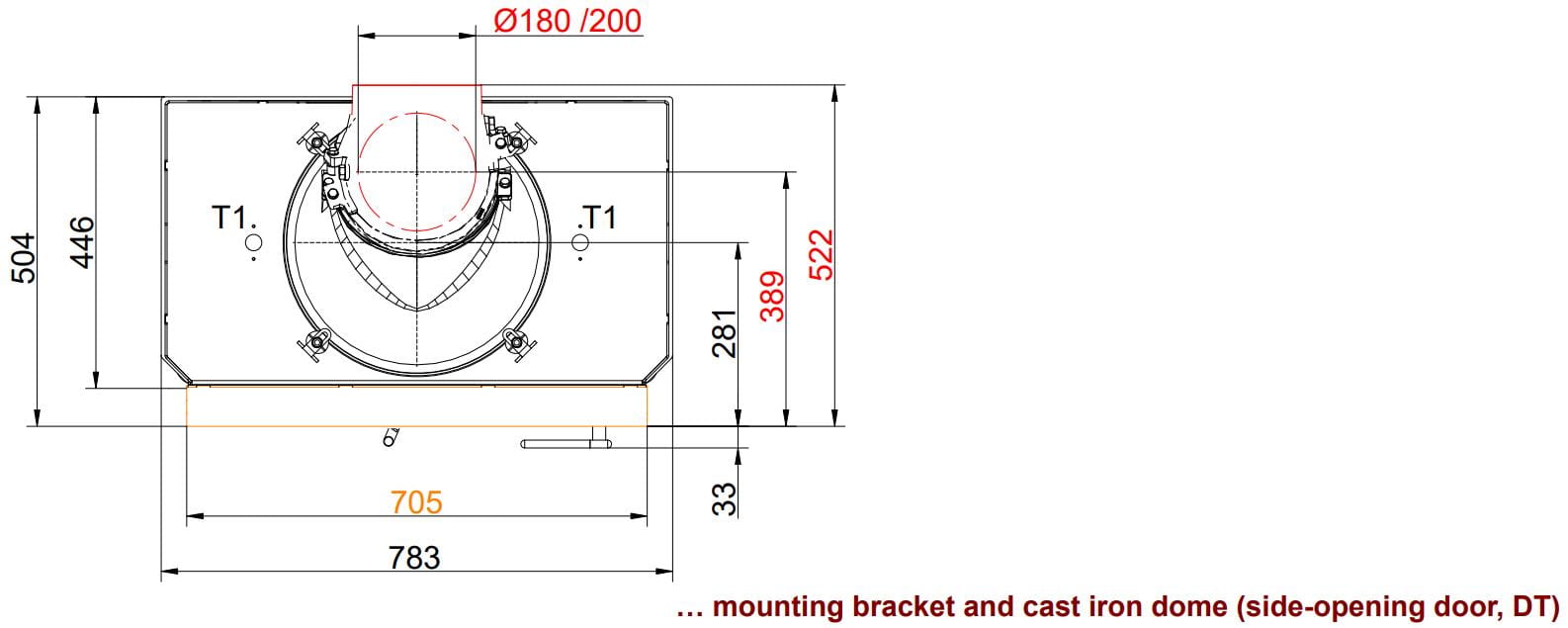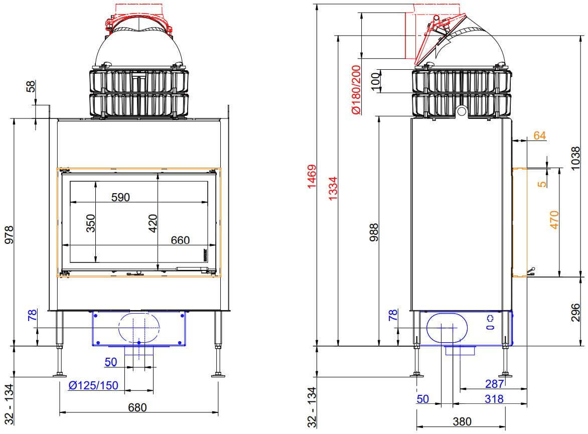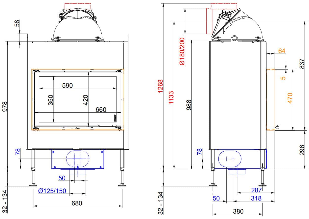 Топочная камера футерована шамотом светлого цвета, который можно заменить на чёрный чугун. Модель с инновационной чашевидной подовой (безколосниковой) системой горения. Топка обладает всеми современными технологиями горения: вторичный дожиг газов и система "Чистое стекло". Очаг с возможностью притока воздуха извне. Для отвода продуктов сгорания необходим дымоход диаметром 200 или 180 мм. Гарантия — 5 лет.