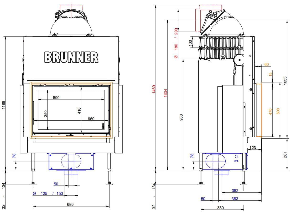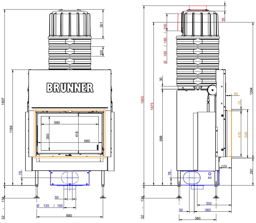Все топки Brunner оснащены современными системами горения: вторичный (дополнительный) дожиг газов, повышающий эффективность горения, и система "Чистое стекло" — по специальным каналам происходит обдув стекла, что обеспечивает его чистоту.