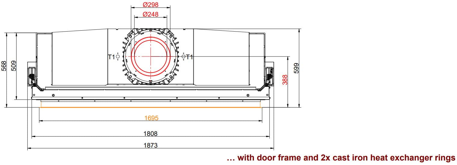Номинальная мощность равна 15 кВт, чего хватает для обогрева помещения в 375 м³. У топки прямое жаропрочное стекло, обрамление вокруг него можно выбрать самостоятельно. Дверца с подъёмным механизмом. Ширина дверцы — 1620 мм, высота — 503 мм.