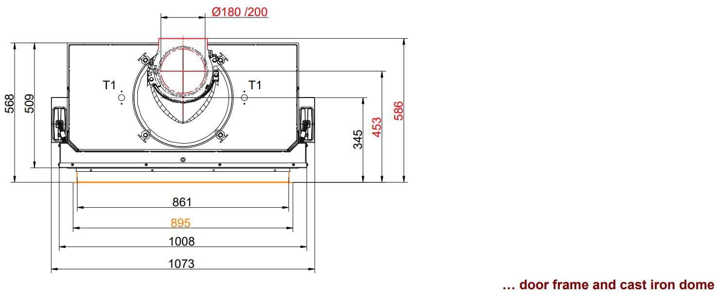 Топочная камера футерована шамотом светлого цвета, который можно заменить на чёрный чугун. Модель с инновационной чашевидной подовой (безколосниковой) системой горения. Топка обладает всеми современными технологиями горения: вторичный дожиг газов и система "Чистое стекло". Очаг с возможностью притока воздуха извне. Для отвода продуктов сгорания необходим дымоход диаметром 200 или 180 мм. Гарантия — 5 лет.