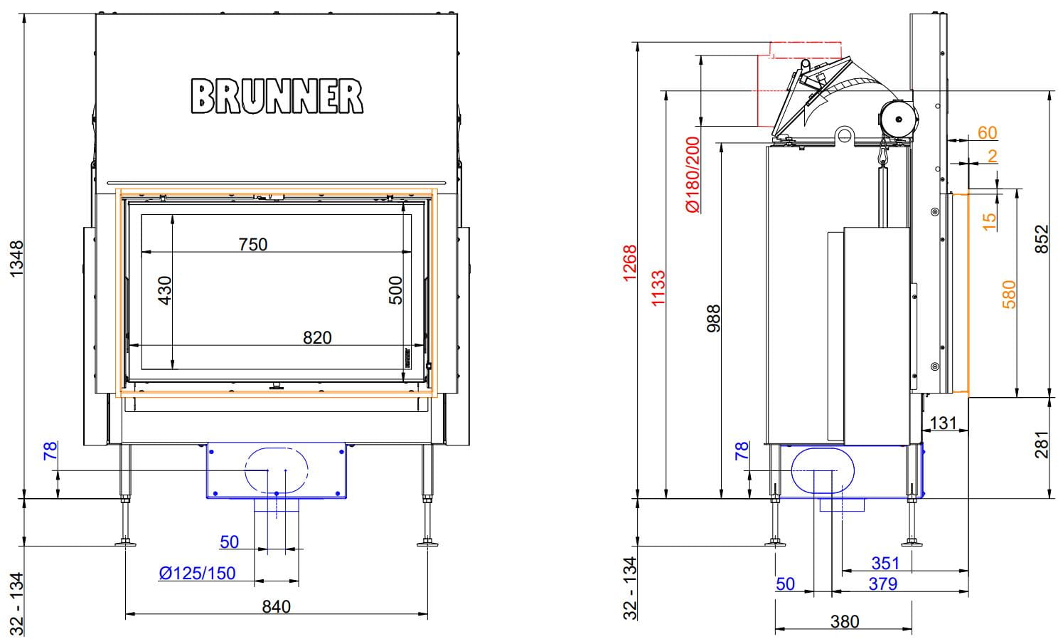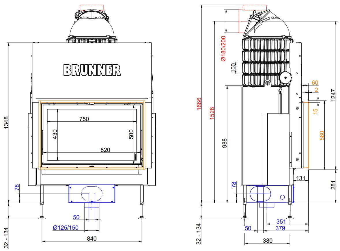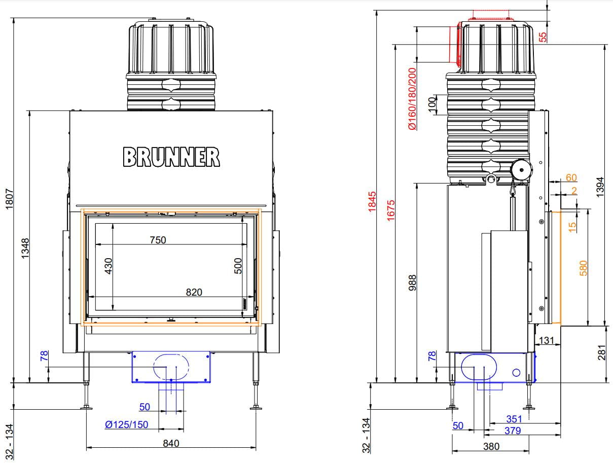 Все топки Brunner оснащены современными системами горения: вторичный (дополнительный) дожиг газов, повышающий эффективность горения, и система "Чистое стекло" — по специальным каналам происходит обдув стекла, что обеспечивает его чистоту.