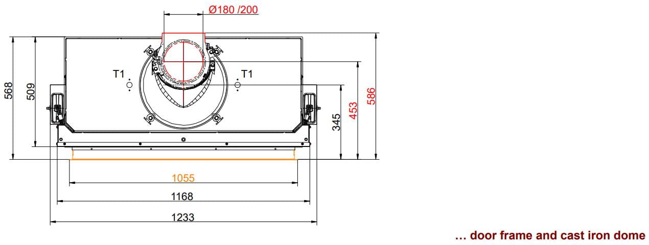 Топочная камера футерована шамотом светлого цвета, который можно заменить на чёрный чугун. Модель с инновационной чашевидной подовой (безколосниковой) системой горения. Топка обладает всеми современными технологиями горения: вторичный дожиг газов и система "Чистое стекло". Очаг с возможностью притока воздуха извне. Для отвода продуктов сгорания необходим дымоход диаметром 200 или 180 мм. Гарантия — 5 лет.