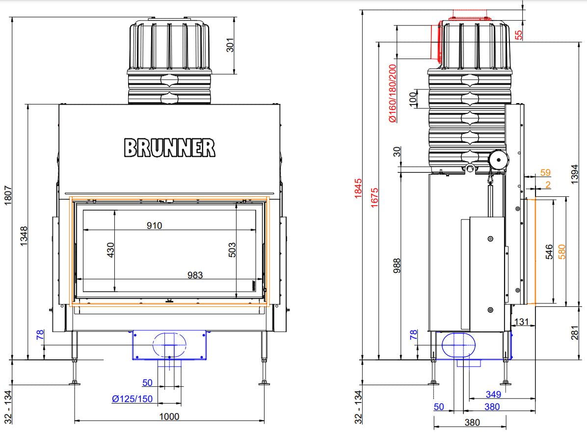 Все топки Brunner оснащены современными системами горения: вторичный (дополнительный) дожиг газов, повышающий эффективность горения, и система "Чистое стекло" — по специальным каналам происходит обдув стекла, что обеспечивает его чистоту.