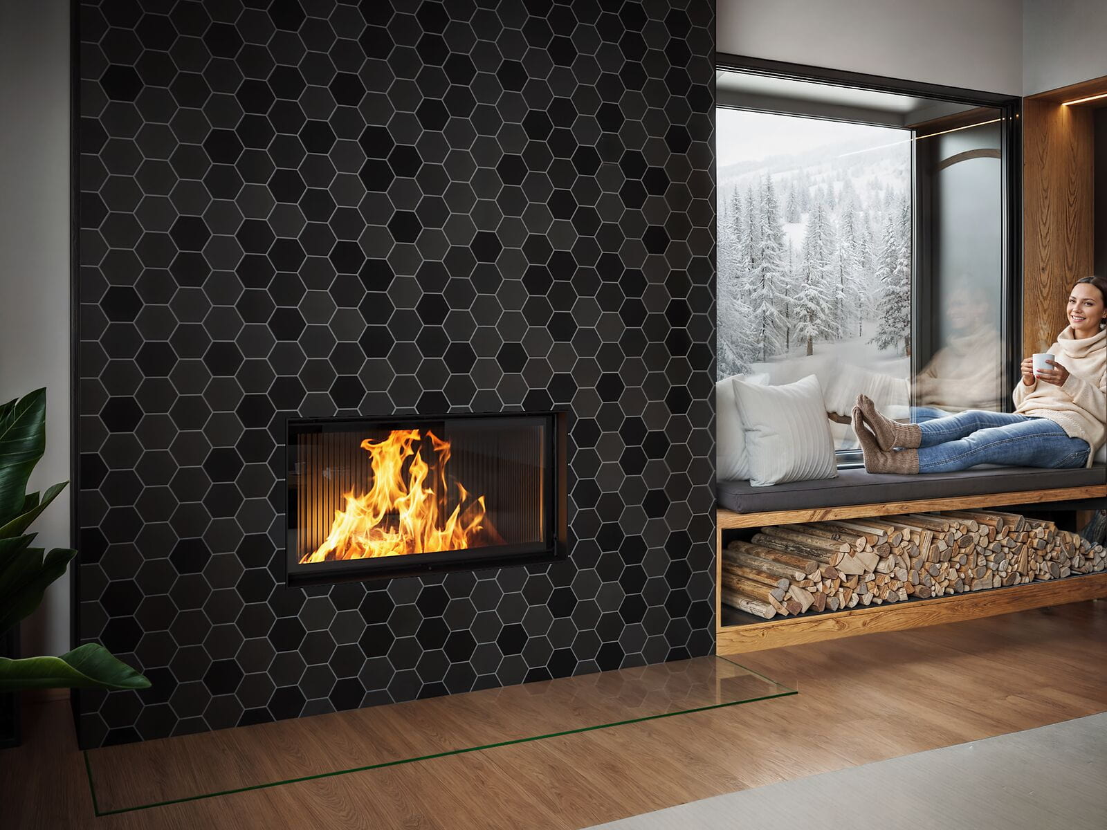 До трети тепловых лучей отражается обратно в камеру сгорания. Само покрытие никак не влияет на обзор пламени. Такое решение позволит уменьшить расстояние до мебели или горючих элементов у топки до 80 см.