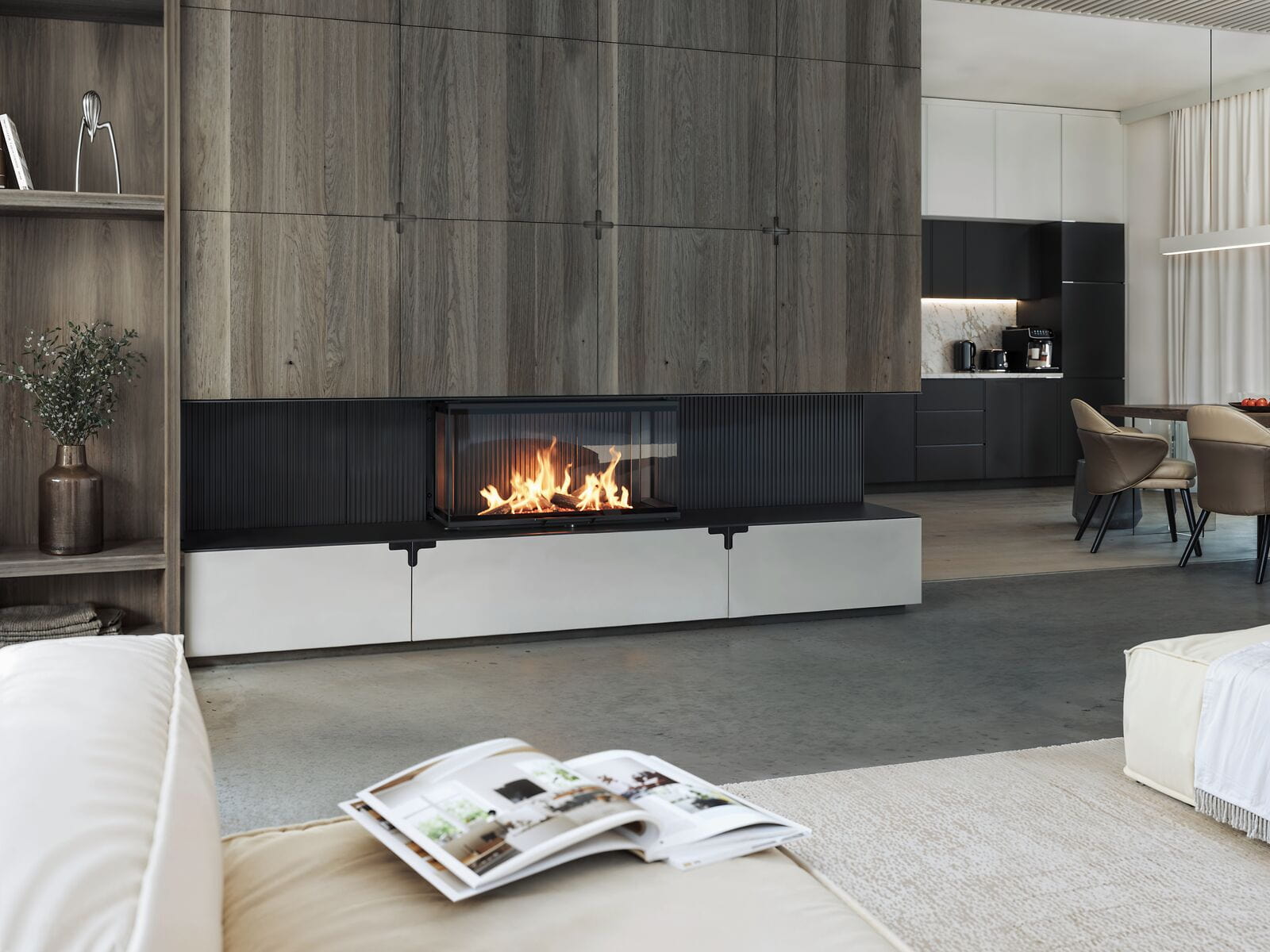 Корпус очагов Panorama выполнен из стали, что обеспечивает быстрый нагрев помещения. Модельный ряд состоит из топок с трехсторонним стеклом. Такие модели можно размещать у стены или использовать в качестве лаконичного завершения межкомнатной перегородки. Дверца всегда оснащаться подъёмным механизмом. Номинальная мощность топок — от 7 до 11 кВт. Гарантия — 5 лет. Подробнее об особенностях топок Brunner BKH 5.0 Panorama: