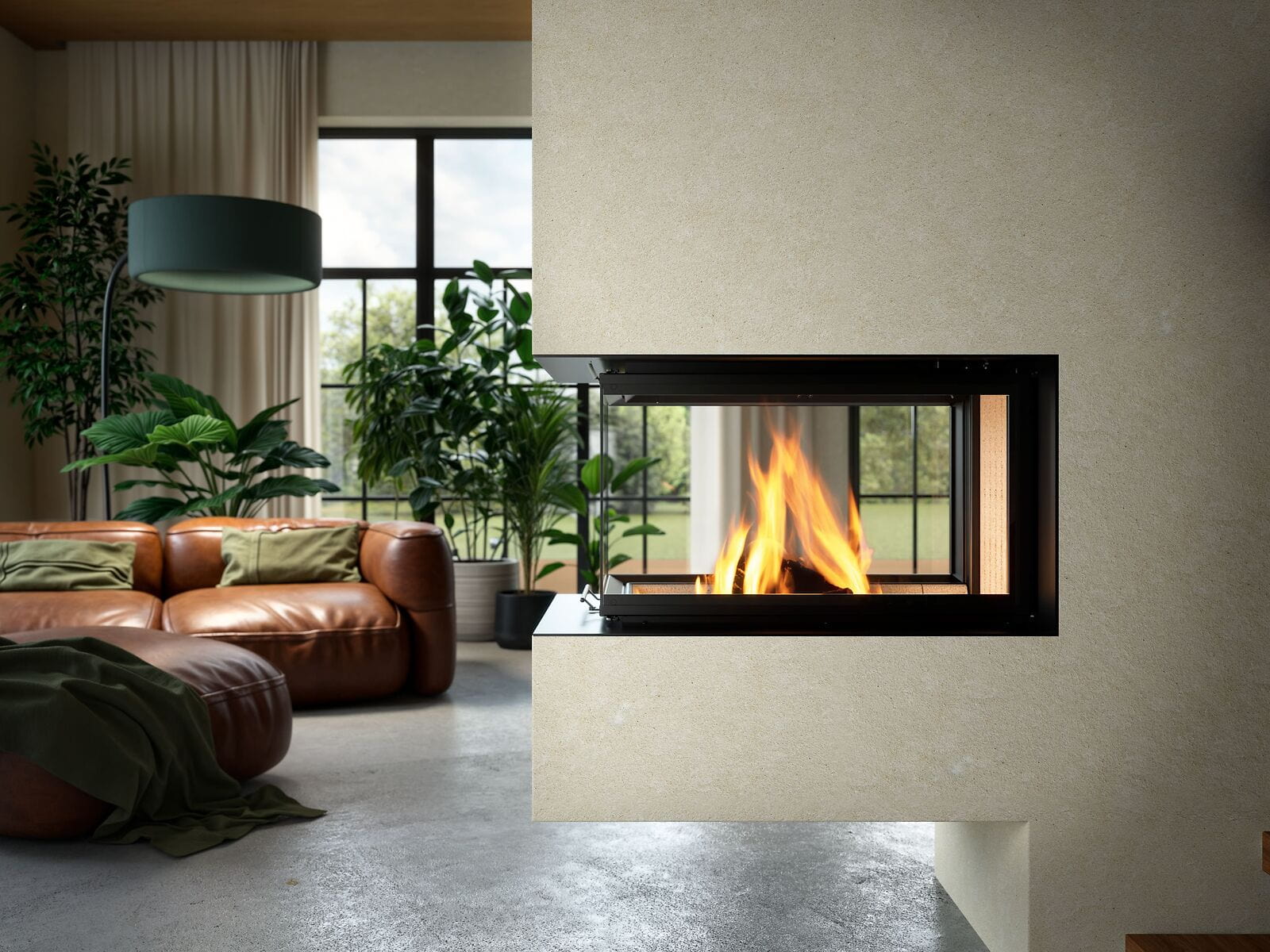 Абсолютное большинство тепловых лучей проходит через керамическое стекло в помещение. Расстояние для размещения мебели или горючих элементов от топки должно составлять не менее 120 см.