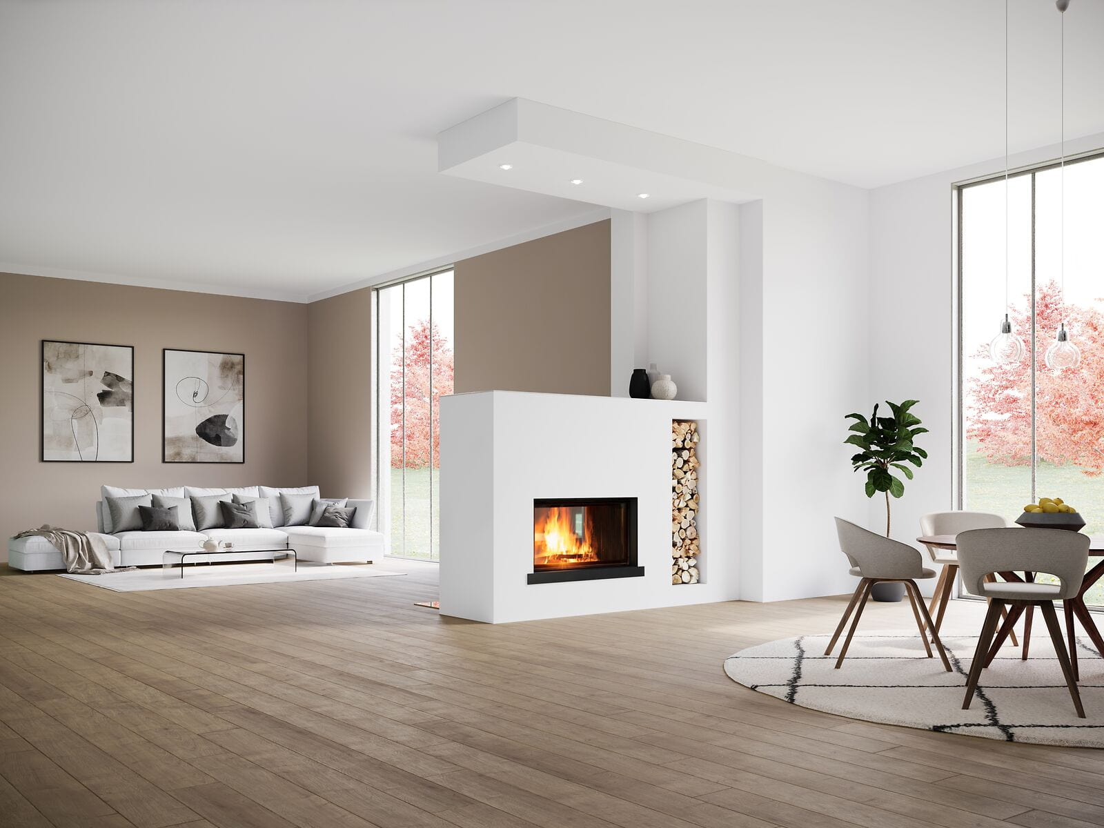 Абсолютное большинство тепловых лучей проходит через керамическое стекло в помещение. Расстояние для размещения мебели или горючих элементов от топки должно составлять не менее 120 см.