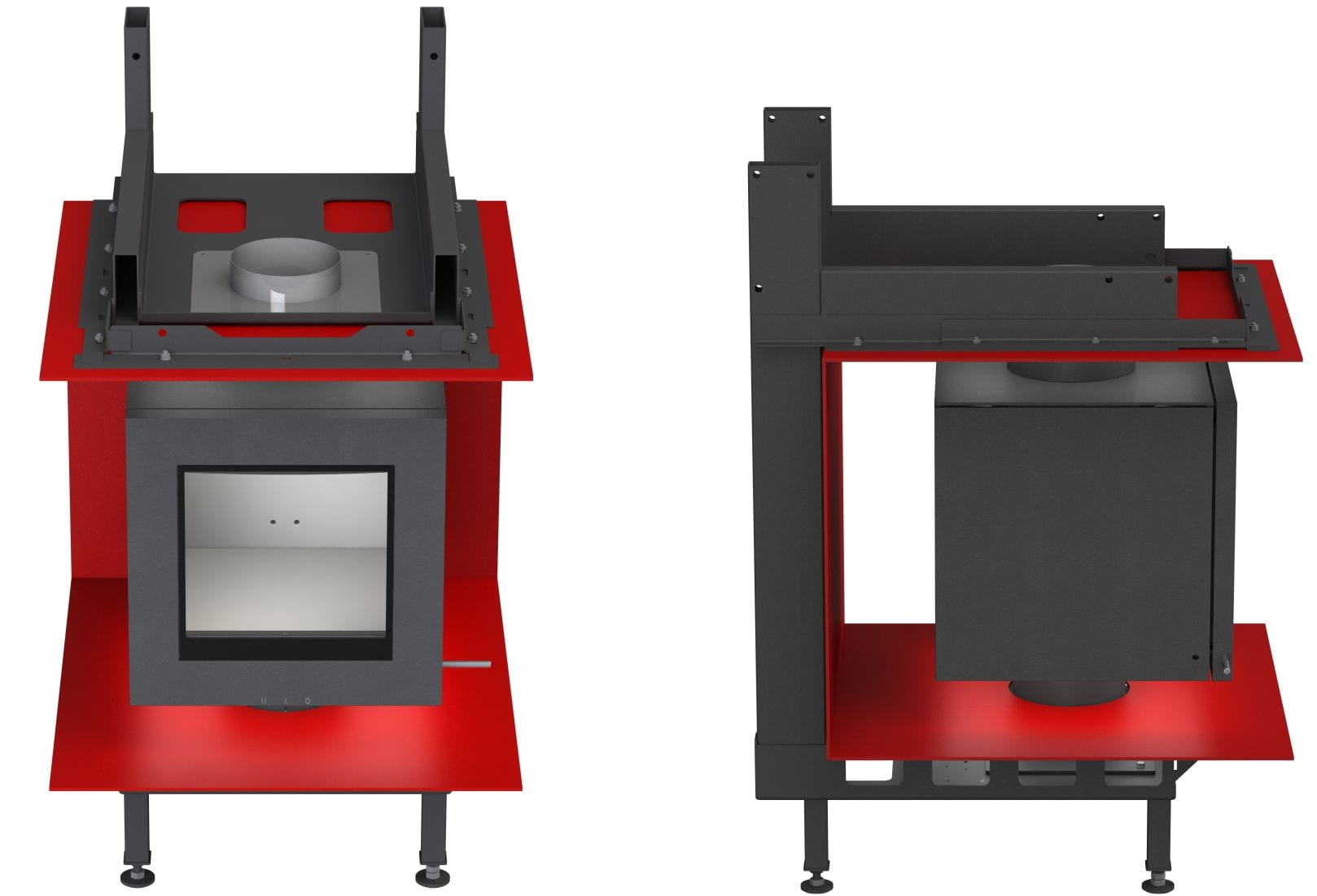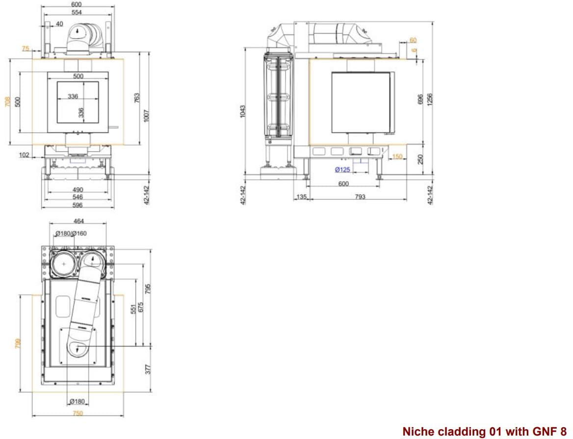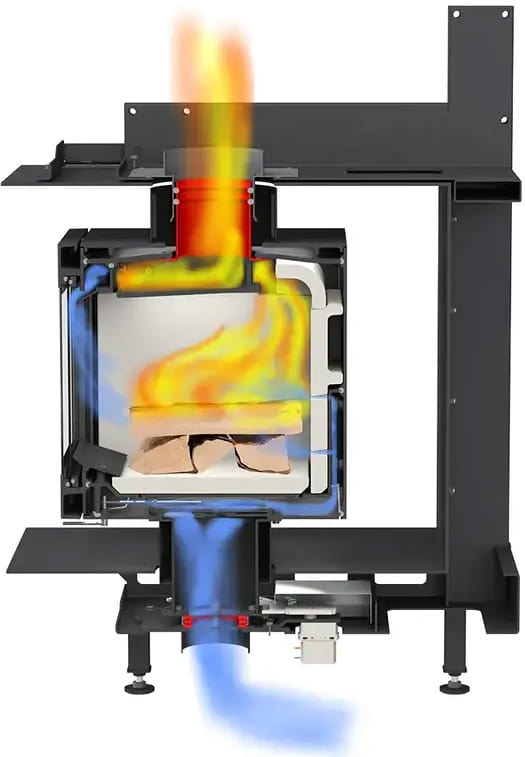Топочная камера футерована шамотом светлого цвета. Модель с подовой (безколосниковой) системой горения. Топка обладает всеми современными технологиями горения: вторичный дожиг газов и система "Чистое стекло". Очаг с возможностью притока воздуха извне. Для отвода продуктов сгорания необходим дымоход диаметром 180 мм. Гарантия — 5 лет.