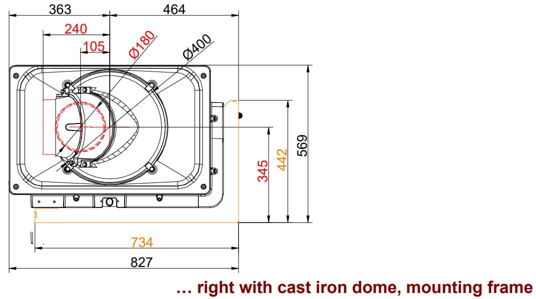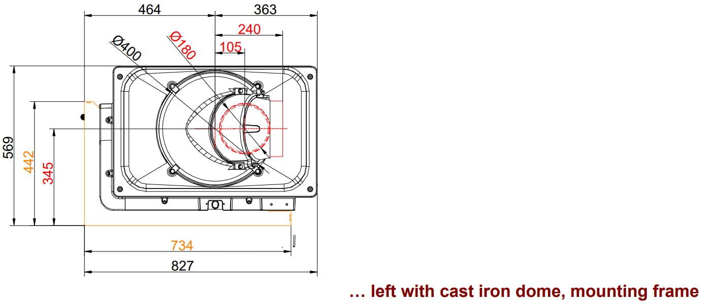 - Чугунный дымосборник — обычное подключение дымохода, может использоваться в сочетании с системами MSS и GNF — объёмными керамическими или чугунными теплонакопительными модулями.