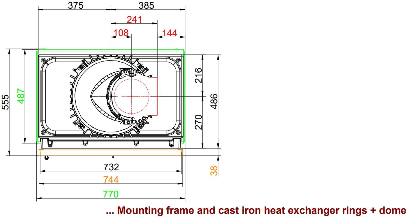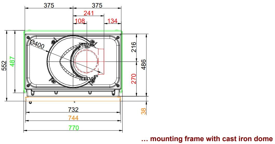 - Фронтальная панель или рама, значительно выступающая по периметру, образующая полноценную законченную конструкцию. Варианты исполнения: окрашенная сталь, нержавеющая сталь или чугун.