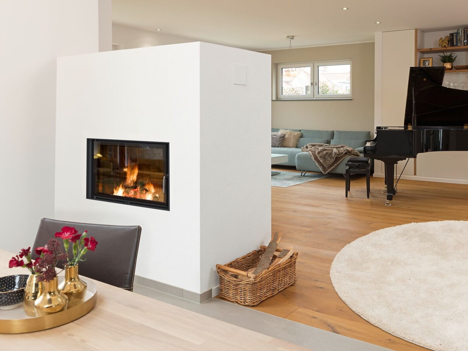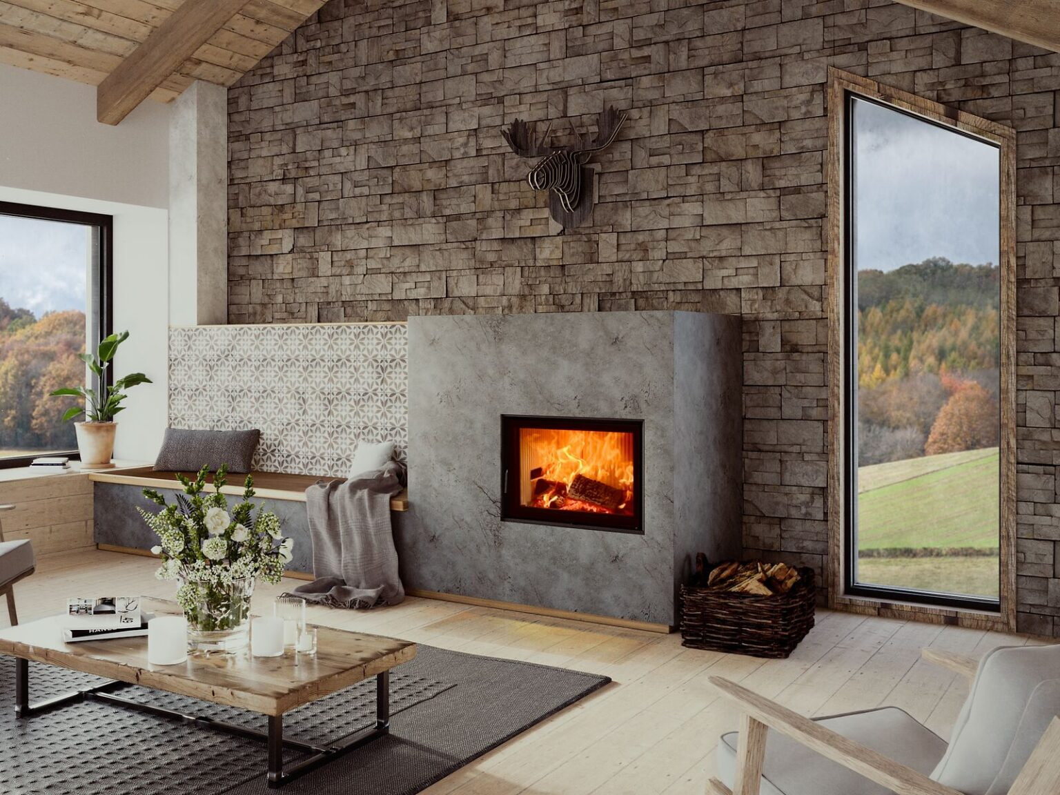 Абсолютное большинство тепловых лучей проходит через керамическое стекло в помещение. Расстояние для размещения мебели или горючих элементов от топки должно составлять не менее 120 см.