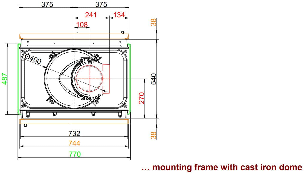 - Фронтальная панель или рама, значительно выступающая по периметру, образующая полноценную законченную конструкцию. Варианты исполнения: окрашенная сталь, нержавеющая сталь или чугун.