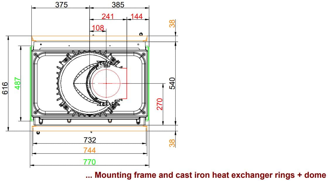 - Монтажная рама, окрашенная в чёрный цвет или выполненная из нержавеющей стали, что делает примыкание топки к облицовке практически незаметным.