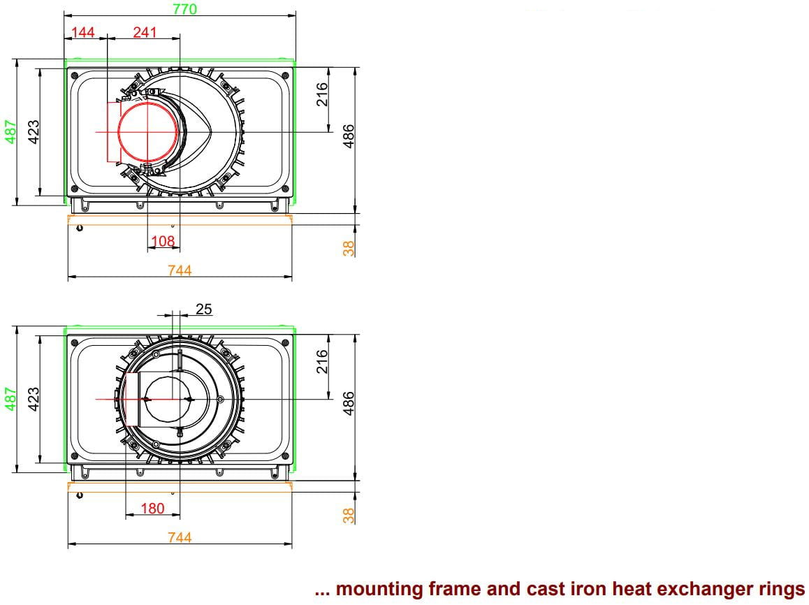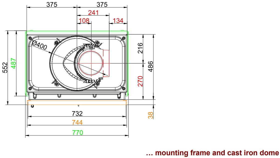 - Фронтальная панель или рама, значительно выступающая по периметру, образующая полноценную законченную конструкцию. Варианты исполнения: окрашенная сталь, нержавеющая сталь или чугун.