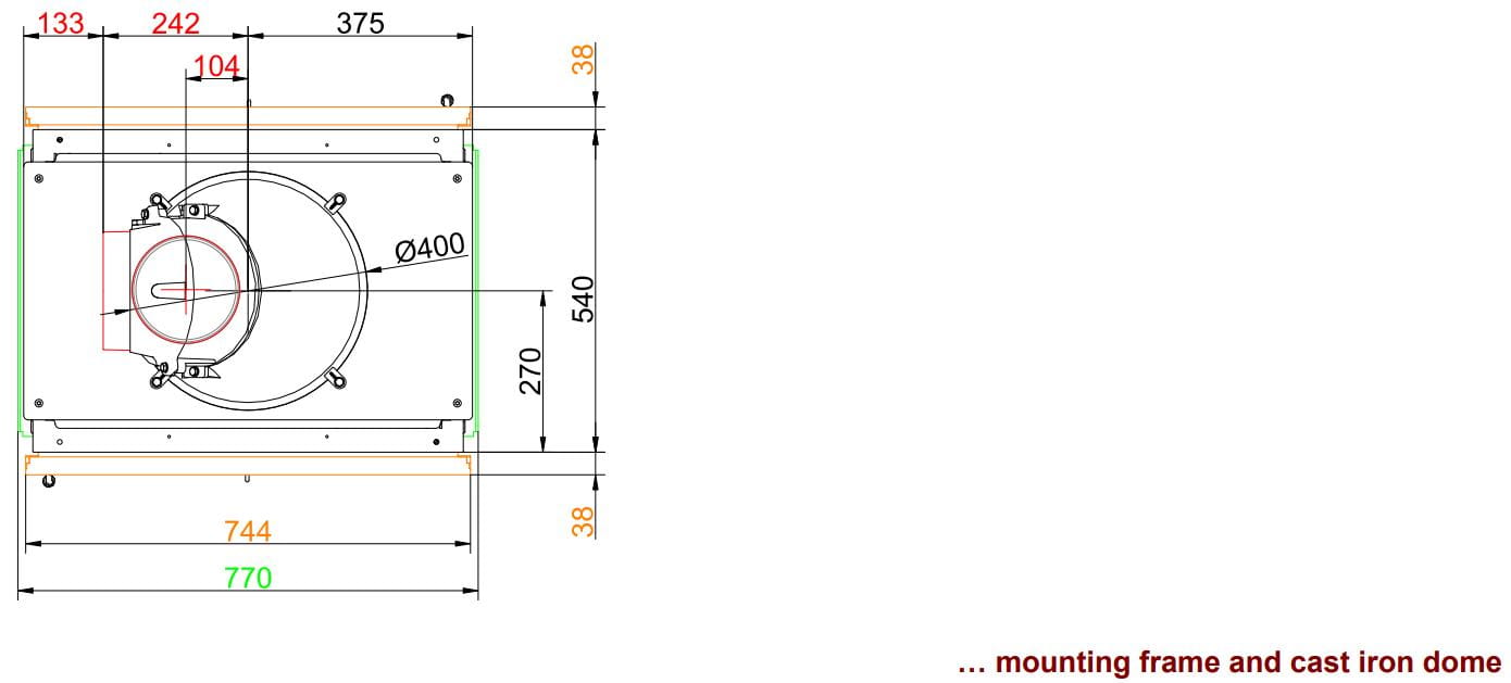 - Фронтальная панель или рама, значительно выступающая по периметру, образующая полноценную законченную конструкцию. Варианты исполнения: окрашенная сталь, нержавеющая сталь или чугун.
