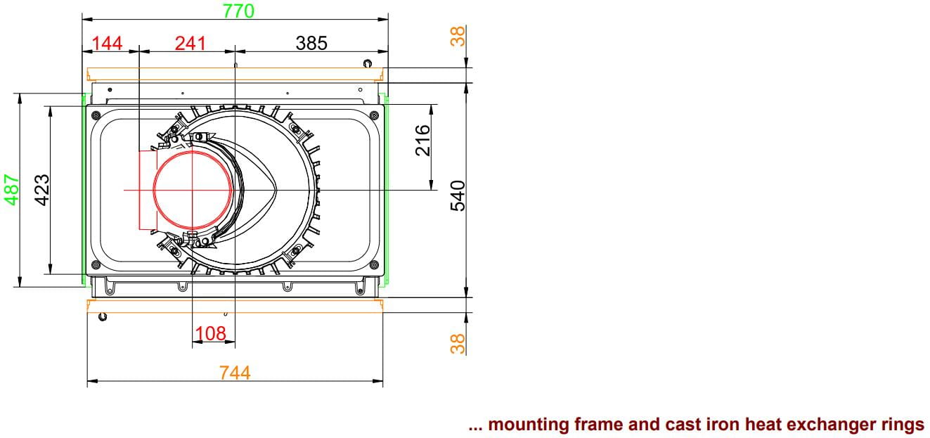 - Чугунный дымосборник — обычное подключение дымохода, может использоваться в сочетании с системами MSS и GNF — объёмными керамическими или чугунными теплонакопительными модулями.