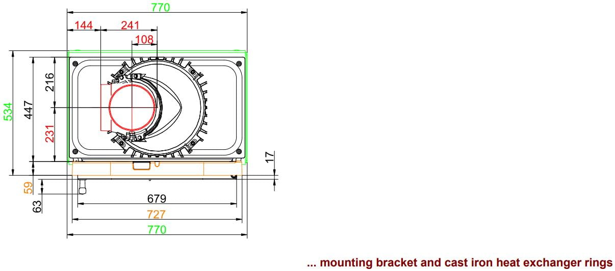 - Чугунный дымосборник — обычное подключение дымохода, может использоваться в сочетании с системами MSS и GNF — объёмными керамическими или чугунными теплонакопительными модулями.