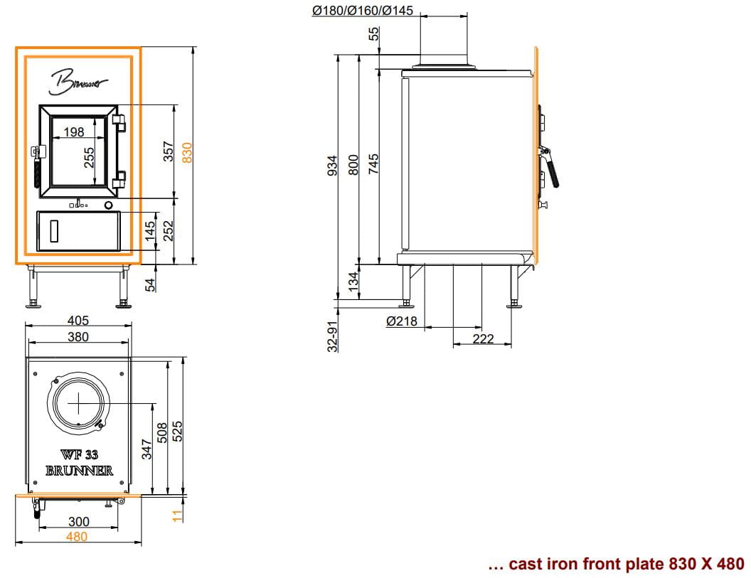 В серии топок Brunner WF покупатель может выбрать размер чугунного обрамления дверцы по своему усмотрению. В зависимости от модели доступно до пяти размеров: