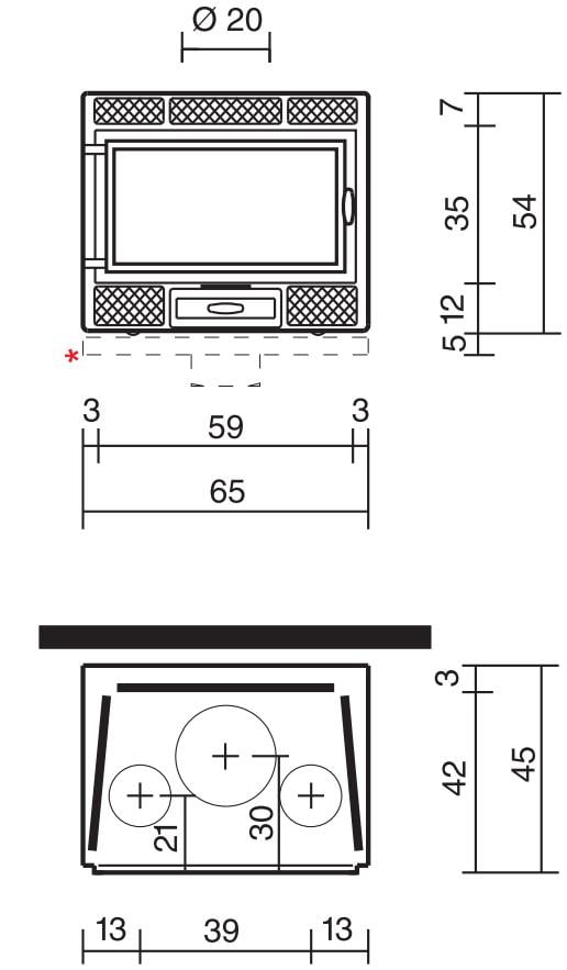 Каминная топка Edilkamin Firebox Deco 54 V (ЭдилКамин Фаербокс Деко 54 В) — это небольшая высокоэффективная модель с толстым стальным корпусом. Версия V — вентилятор принудительной вентиляции. Мощность устройства составляет 9 кВт, чего хватает для обогрева помещения в 235 м³. КПД — 77.3%. У топки прямое жаропрочное стекло. Дверца с боковым открыванием. Ширина дверцы — 590 мм, высота — 350 мм.