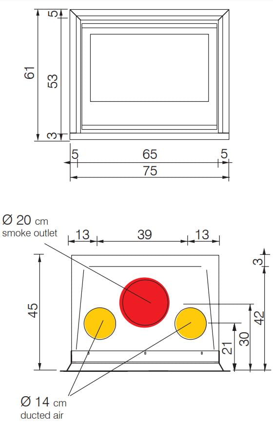 Топочная камера футерована чугуном. На дне топки колосник с расположенным под ним зольным ящиком. Модель обладает всеми современными технологиями горения: вторичный дожиг газов и система "Чистое стекло". Очаг с возможностью притока воздуха извне и распределения горячего воздуха по комнатам (конвекционных кожух). Для отвода продуктов сгорания необходим дымоход диаметром 200 мм.