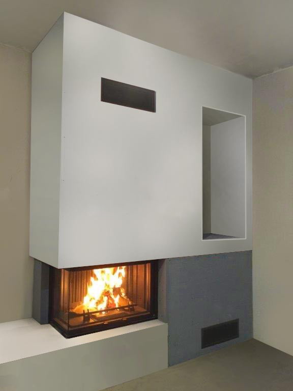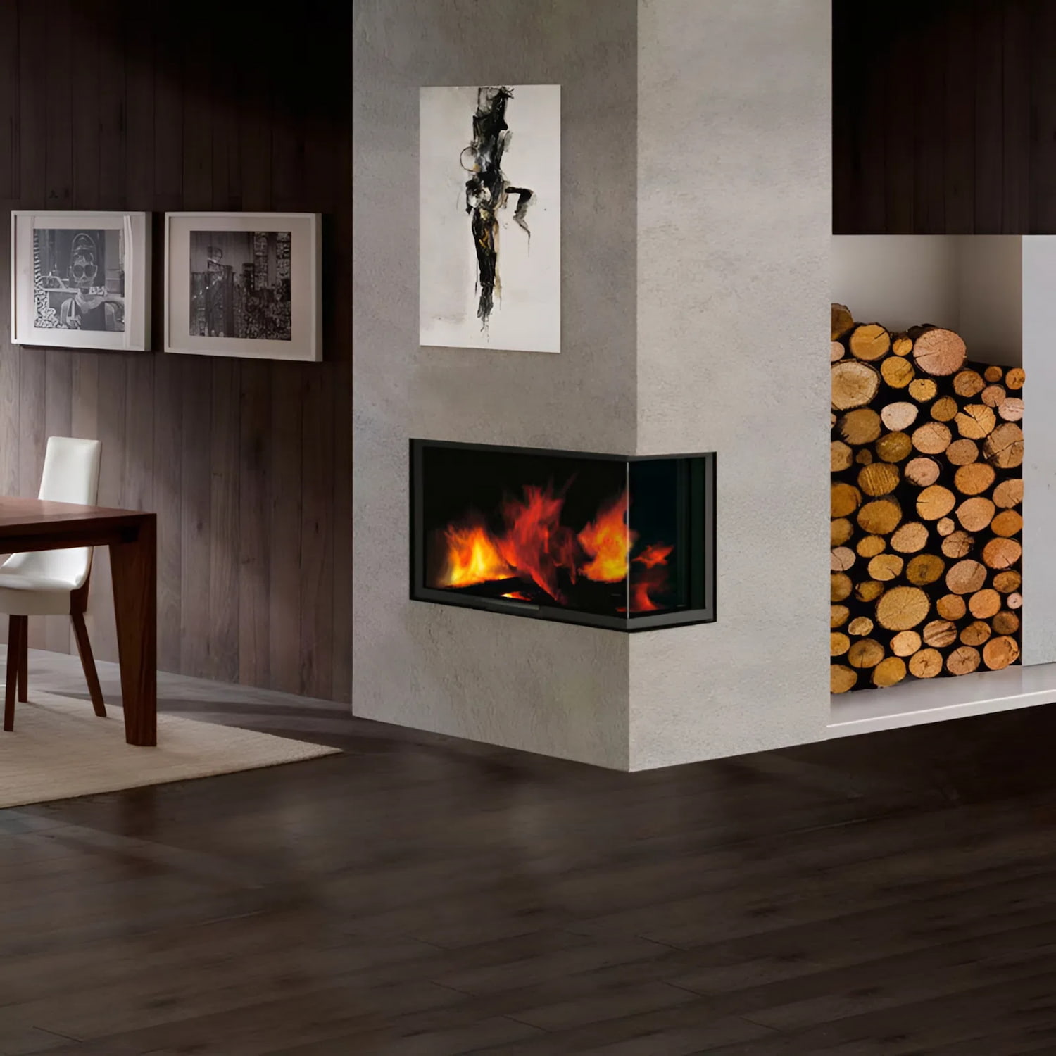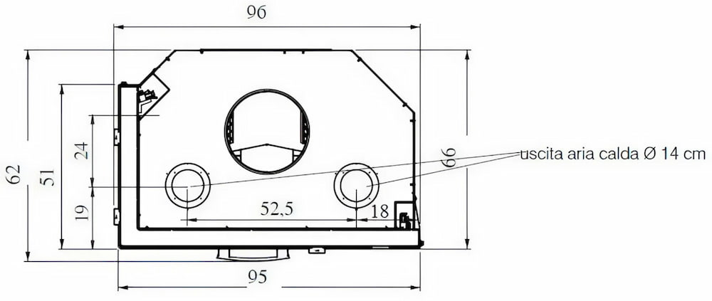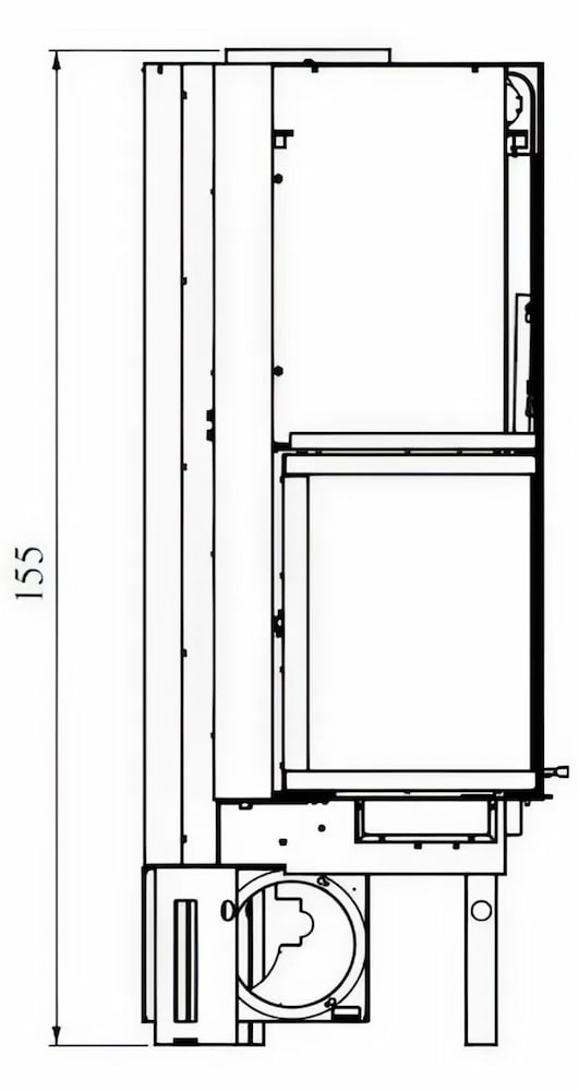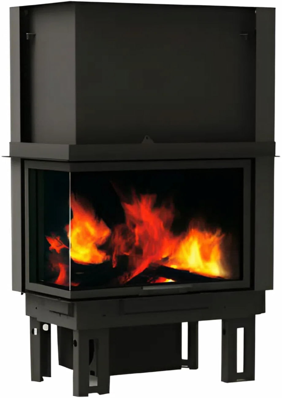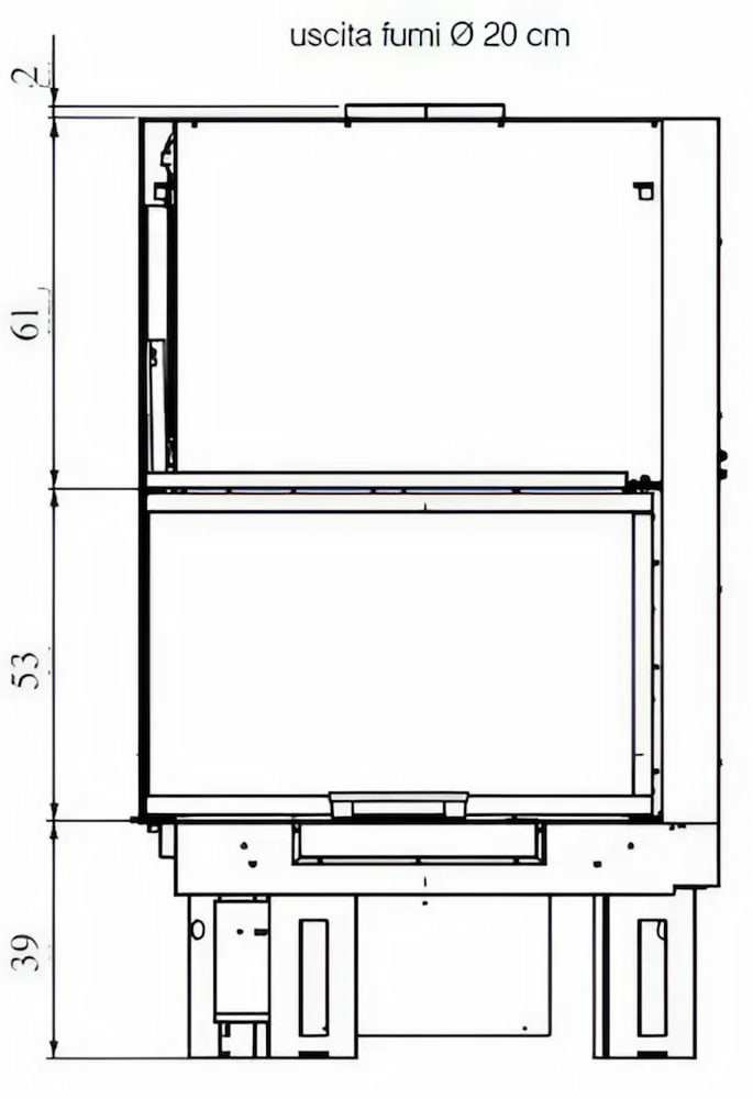 Топочная камера футерована чугуном. На дне топки колосник с расположенным под ним зольным ящиком. Модель обладает всеми современными технологиями горения: вторичный дожиг газов и система "Чистое стекло". Очаг с возможностью притока воздуха извне и распределения горячего воздуха по комнатам (конвекционных кожух). Для отвода продуктов сгорания необходим дымоход диаметром 200 мм.