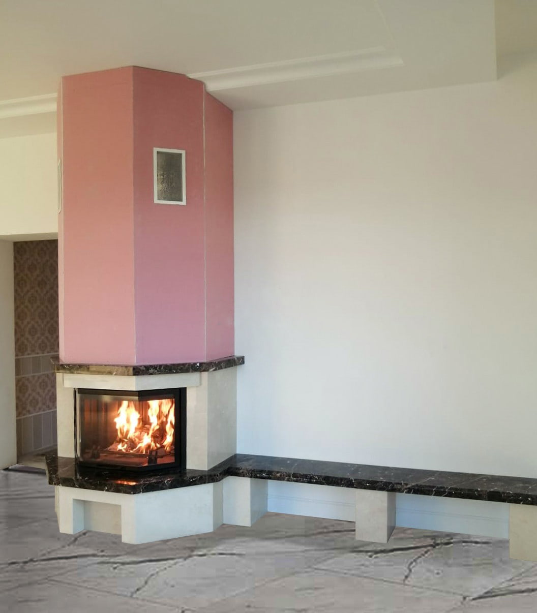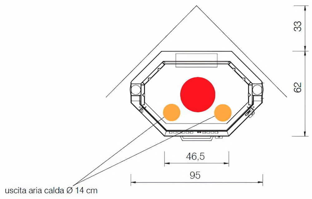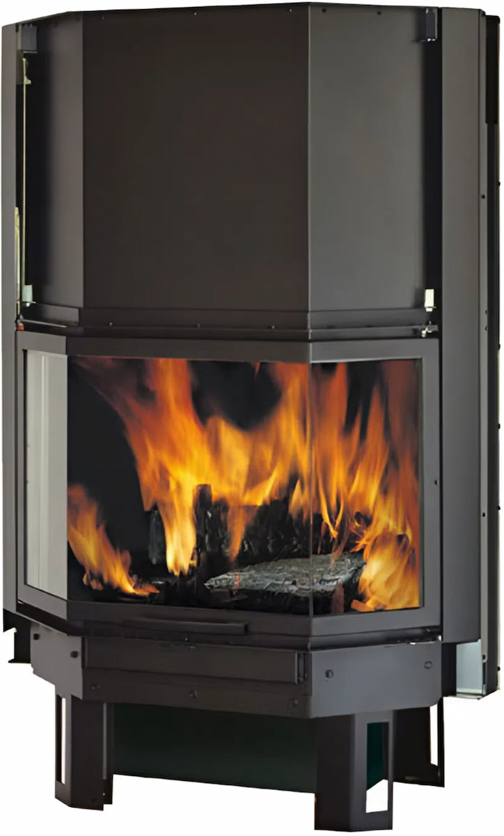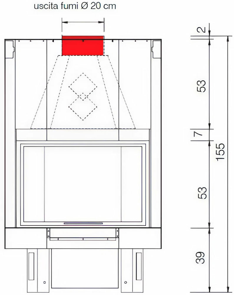 Топочная камера футерована чугуном. На дне топки колосник с расположенным под ним зольным ящиком. Модель обладает всеми современными технологиями горения: вторичный дожиг газов и система "Чистое стекло". Очаг с возможностью притока воздуха извне и распределения горячего воздуха по комнатам (конвекционных кожух). Для отвода продуктов сгорания необходим дымоход диаметром 200 мм.
