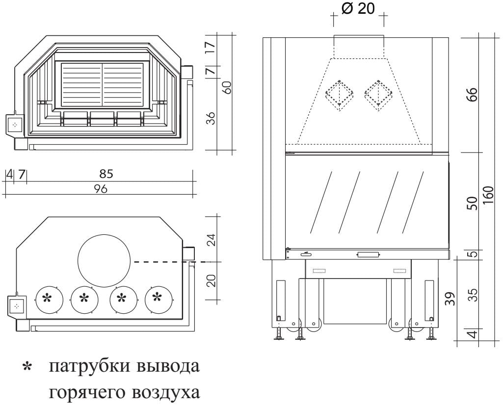 Топочная камера футерована огнеупорным кирпичом. На дне топки колосник с расположенным под ним зольным ящиком. Модель обладает всеми современными технологиями горения: вторичный дожиг газов и система "Чистое стекло". Очаг с возможностью притока воздуха извне и распределения горячего воздуха по комнатам (конвекционных кожух). Для отвода продуктов сгорания необходим дымоход диаметром 200 мм.