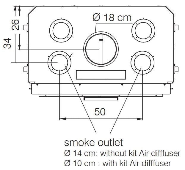 Топочная камера футерована огнеупорной керамикой белого цвета. На дне топки колосник с расположенным под ним зольным ящиком. Топка обладает всеми современными технологиями горения: вторичный дожиг газов и система "Чистое стекло". Очаг с возможностью притока воздуха извне и подключения вентилятора принудительной вентиляции, управлять которым можно с помощью пульта Д/У. Для отвода продуктов сгорания необходим дымоход диаметром 180 мм.