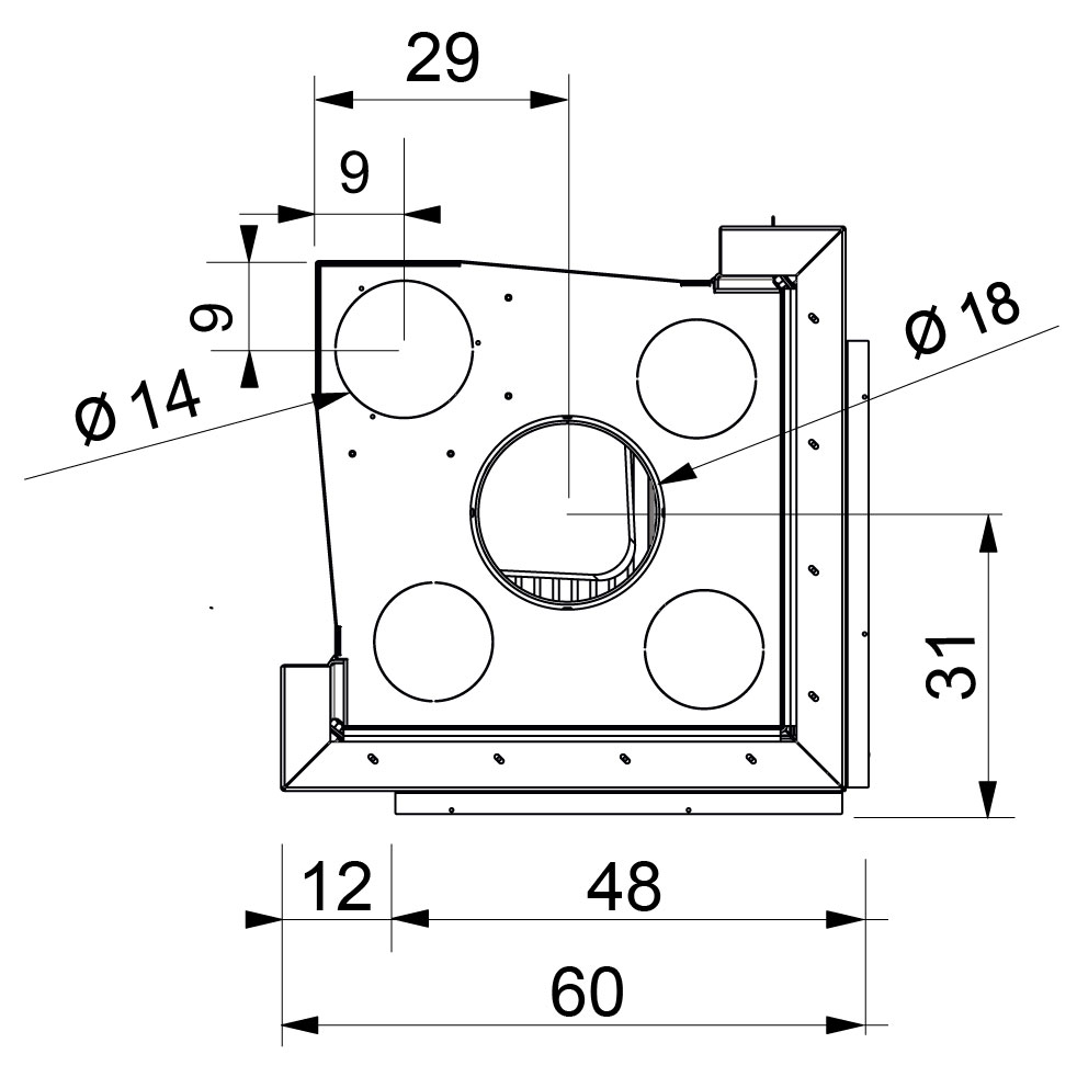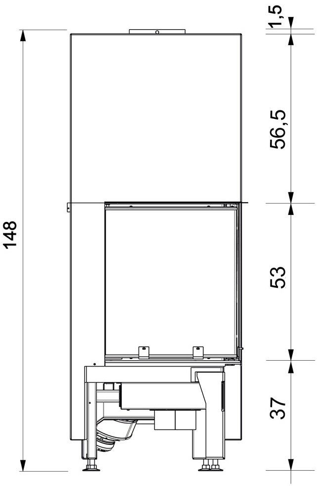 Очаг с возможностью притока воздуха извне, подключения вентилятора принудительной вентиляции, управлять которым можно с помощью пульта Д/У и распределения горячего воздуха по комнатам (конвекционных кожух). Для отвода продуктов сгорания необходим дымоход диаметром 180 мм.