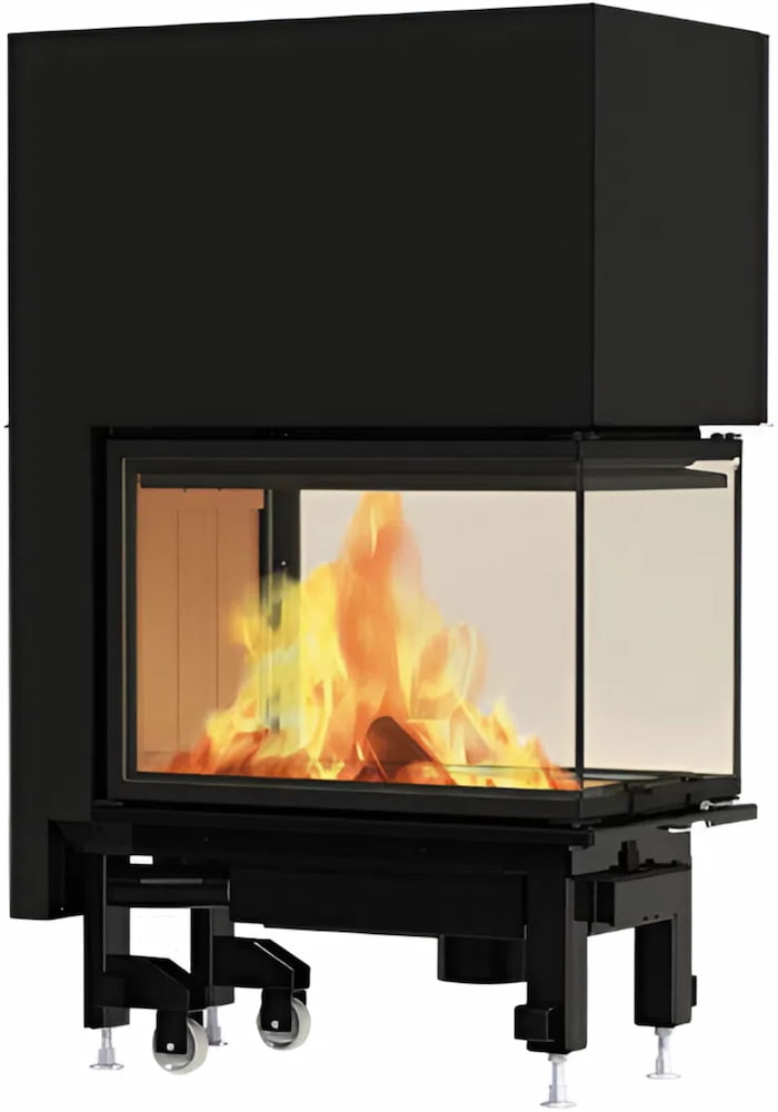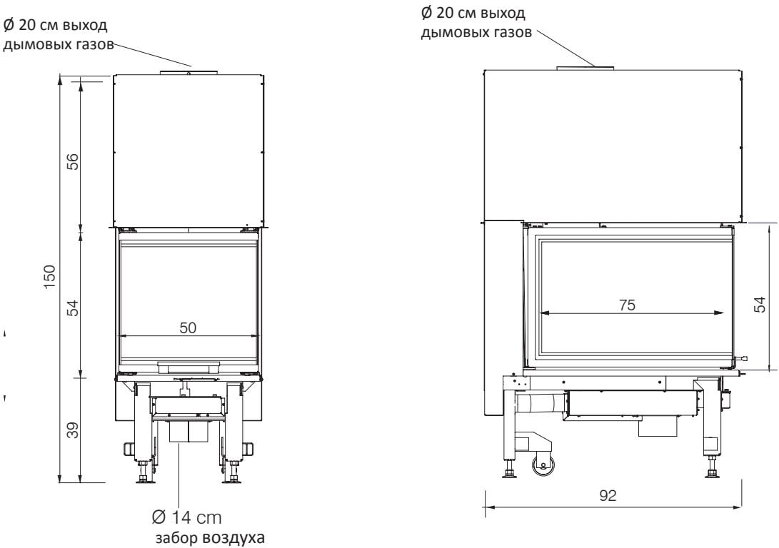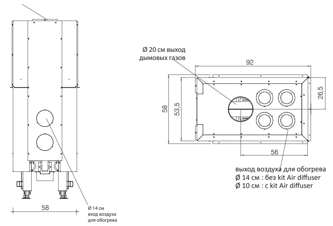 Очаг с возможностью притока воздуха извне, подключения вентилятора принудительной вентиляции, управлять которым можно с помощью пульта Д/У и распределения горячего воздуха по комнатам (конвекционных кожух). Для отвода продуктов сгорания необходим дымоход диаметром 200 мм.
