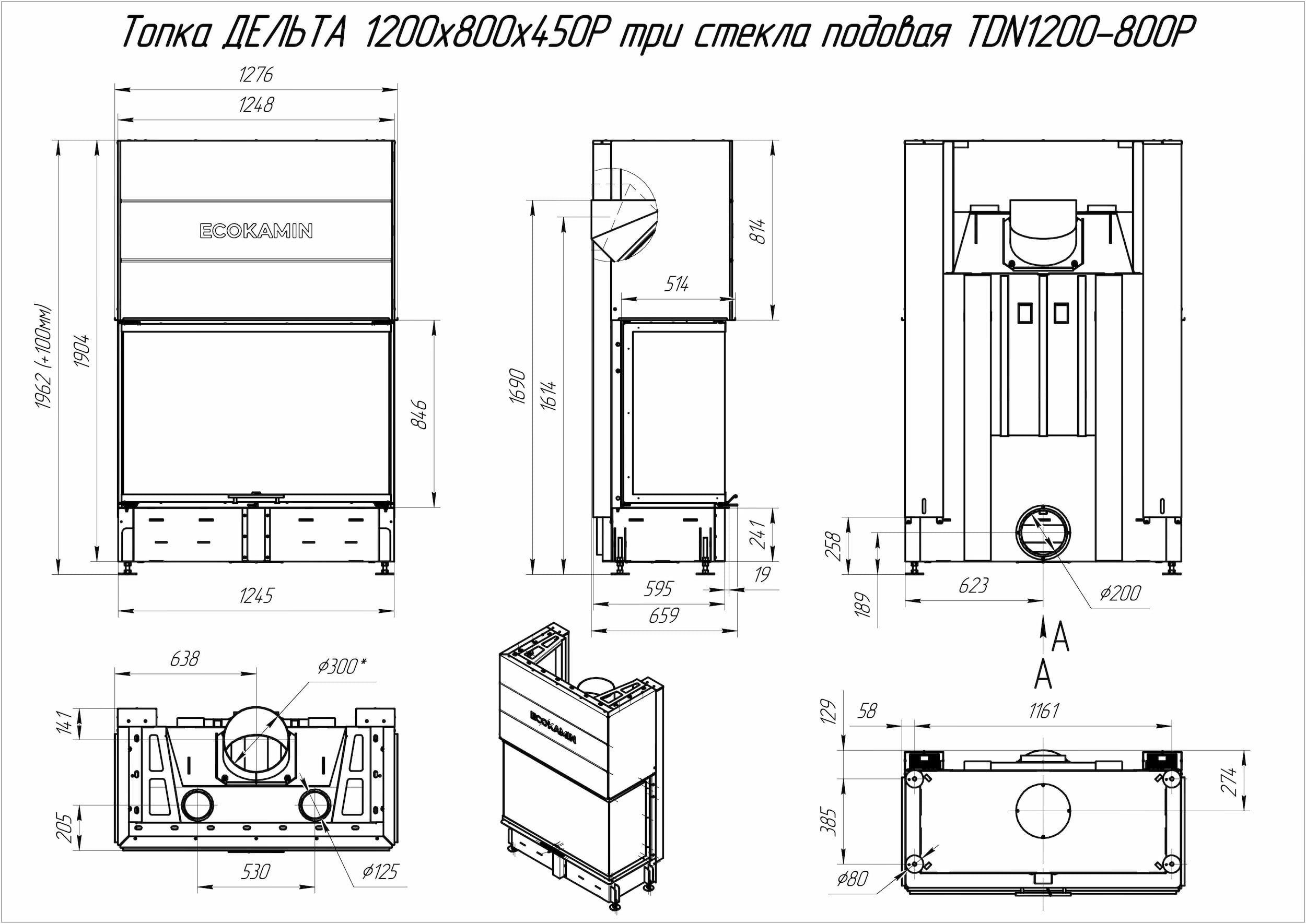 Каминная топка ЭкоКамин Дельта 1200x800x450 P три стекла подовая (TDN1200-800P)