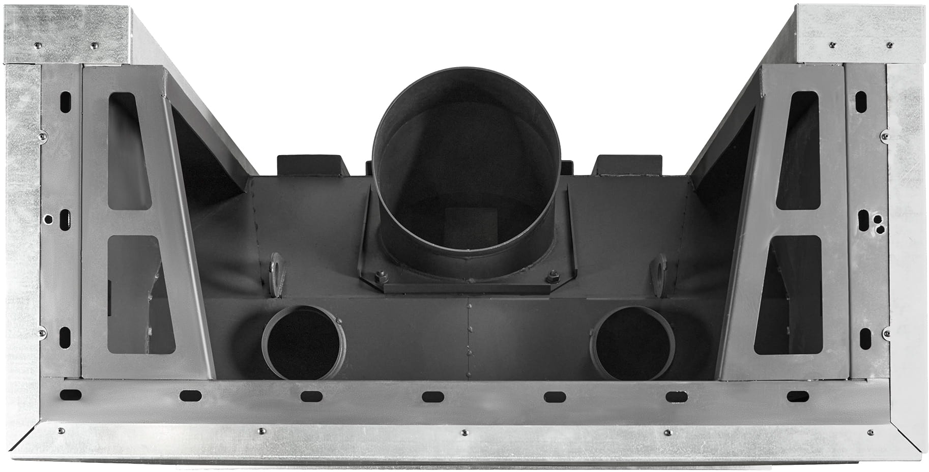 - Система тепловой разводки имеет два встроенных патрубка диаметром 125 мм для подключения системы распределения теплого воздуха в смежные помещения и позволяет увеличить площадь обогреваемых помещений.