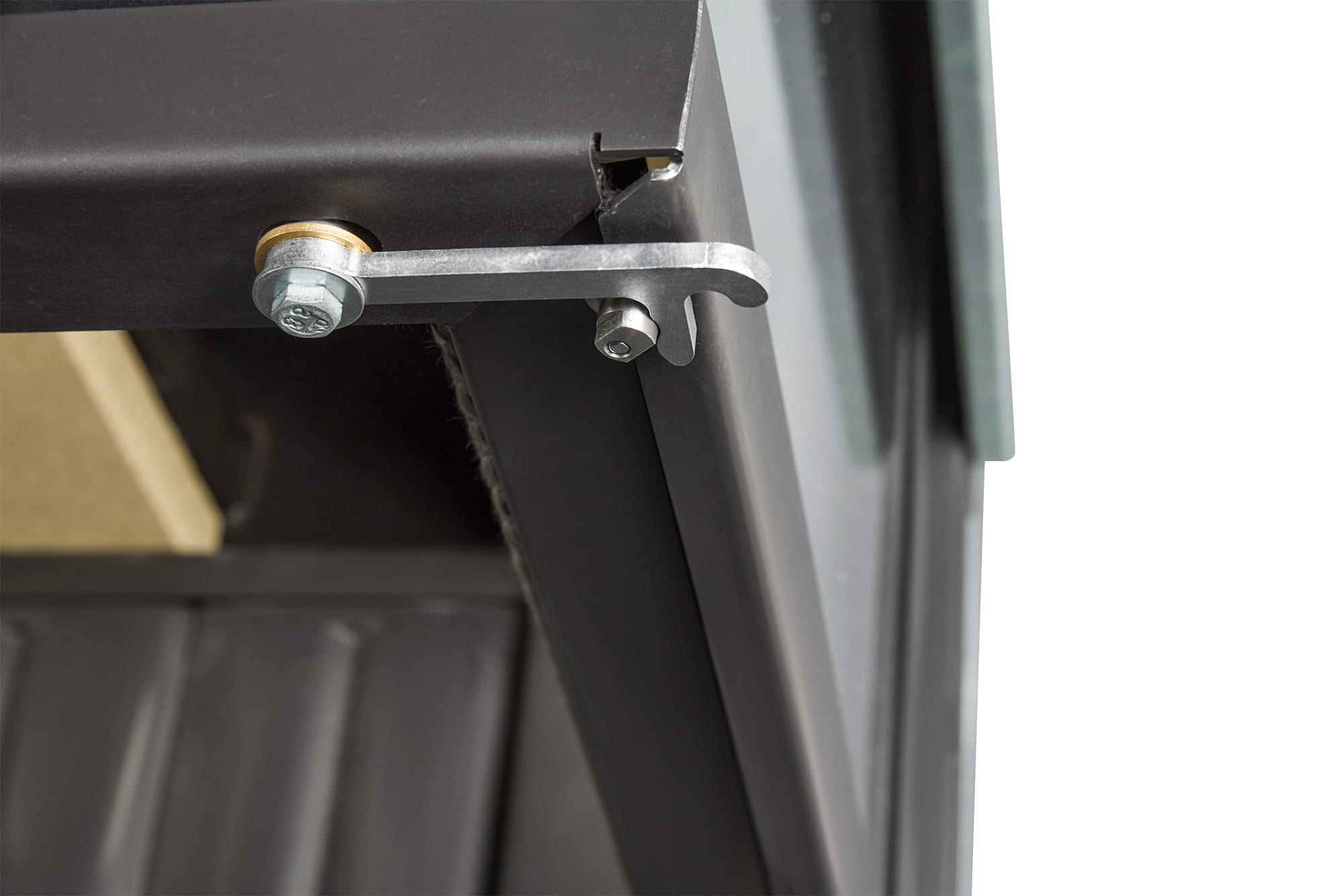 - Бесшумная и надежная тросовая система с противовесом и жаропрочными подшипниками, позволяет открывать дверцу топки вверх и производить закладку дров в топочную камеру.