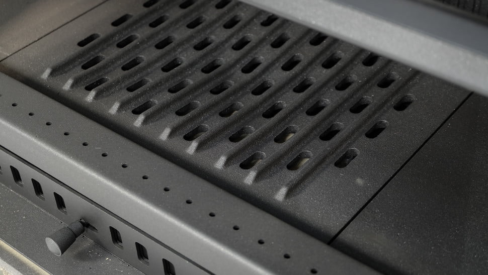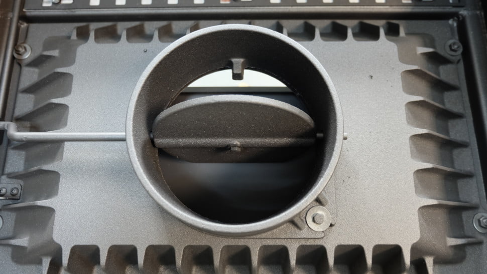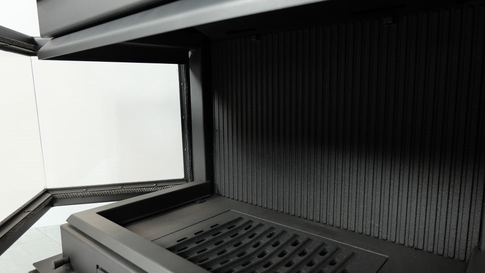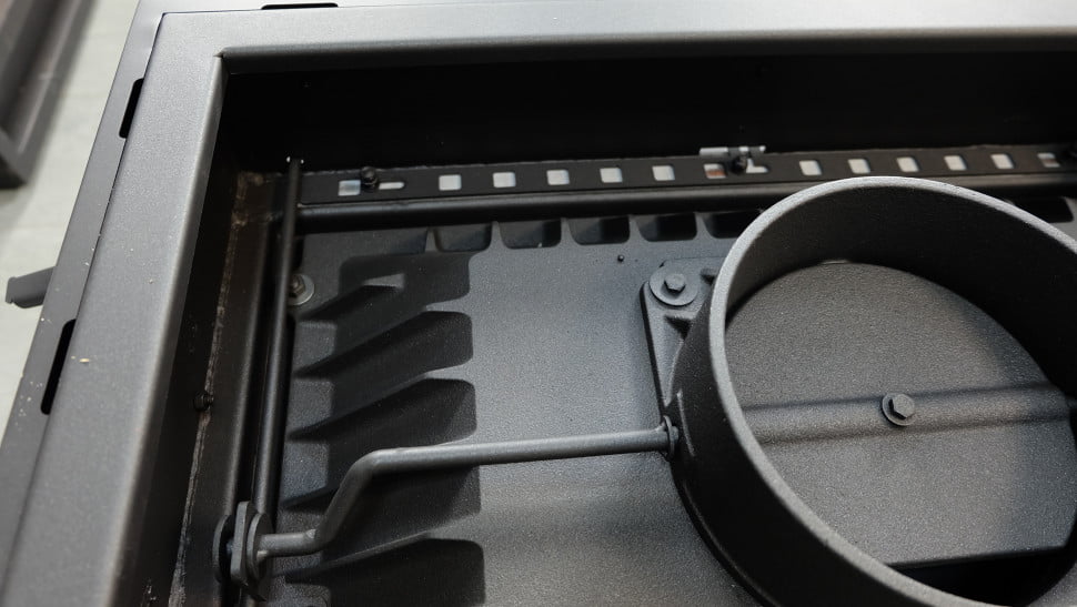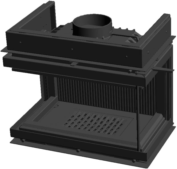 Топочная камера с двойной задней стенкой выполнена из чугуна. Модель оснащена чугунным колосником и зольным ящиком. Топка обладает следующими технологиями горения: система "Чистое стекло" и регулируемая шиберная заслонка. Очаг с возможностью притока воздуха извне. Для подключения необходим дымоход диаметром 200 мм. Гарантия — 3 года.