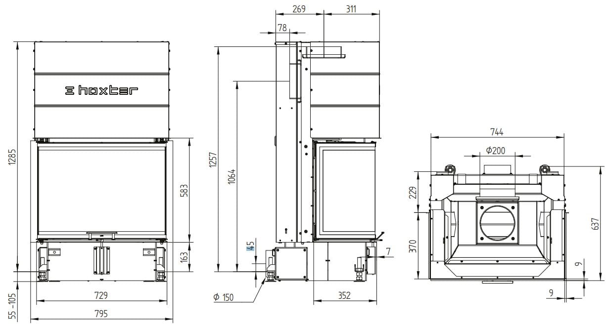 Также все модели Hoxter имеют возможность подвода воздуха на горение извне (из соседнего помещения или улицы). Для этого в конструкции предусмотрен патрубок диаметром 125 или 150 мм.