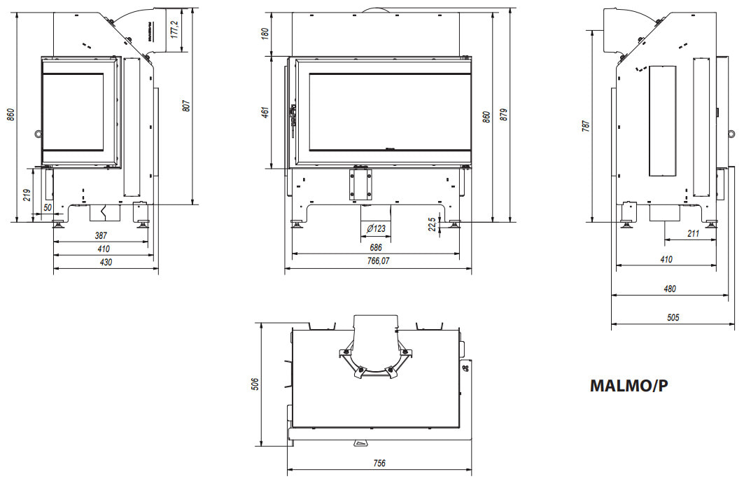 Боковые и фронтальная часть корпуса каминной топки Malmo изготовлены из высококачественной стали. Плотно расположенные радиаторы обеспечивают высокую эффективность и максимальное использование тепла. Топка футерована керамическим материалом, повышающим температуру в камере сгорания. Приток воздуха в камеру сгорания может осуществляться через вставку для забора наружного воздуха диаметром 125 мм.