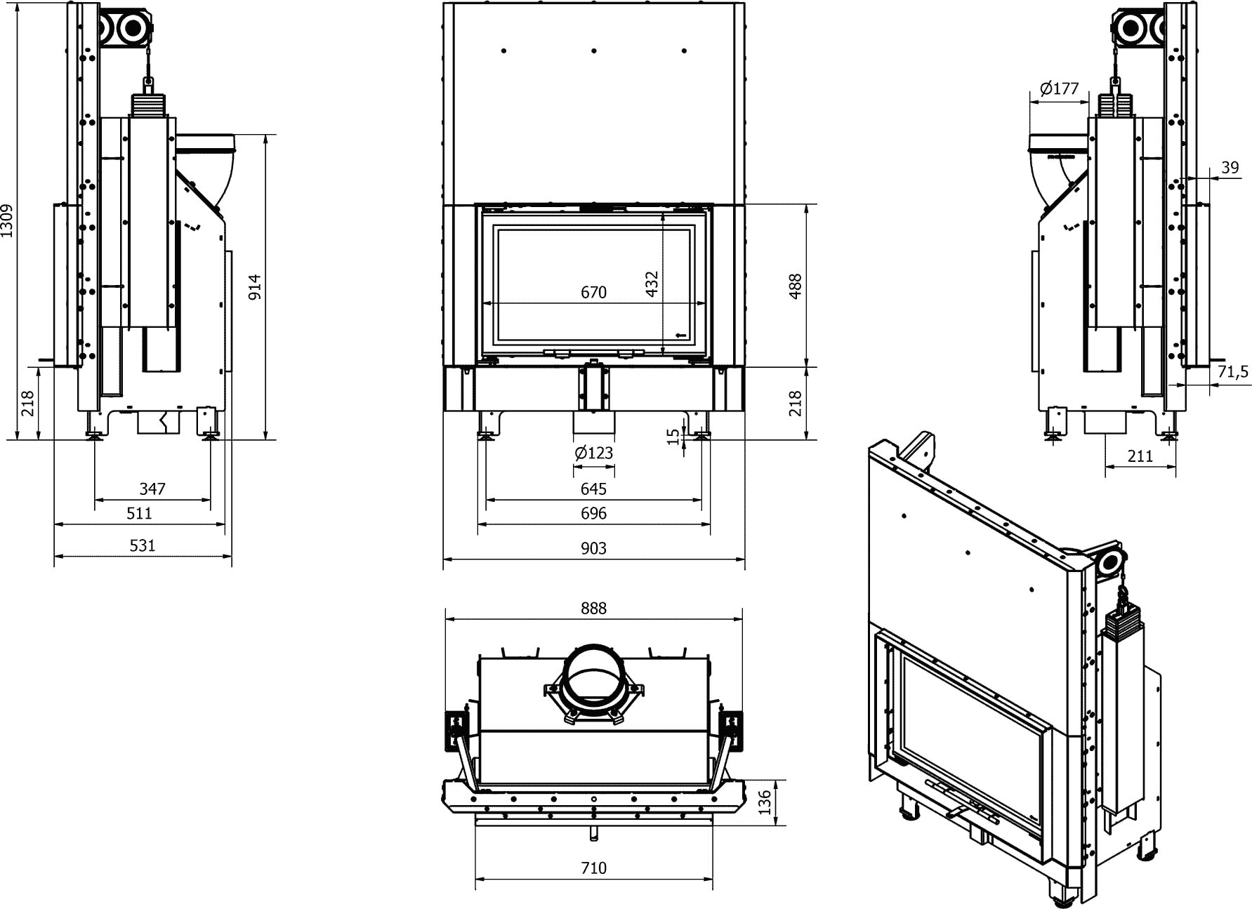 Прямое стекло имеет достаточно большой обзор на огонь. Стенки топочной камеры футерованы термоустойчивым материалом Termotec (Термотек) черного или белого цвета на выбор. Горение подовое. Для отвода продуктов сгорания необходим дымоход диаметром 180 мм.
