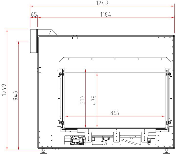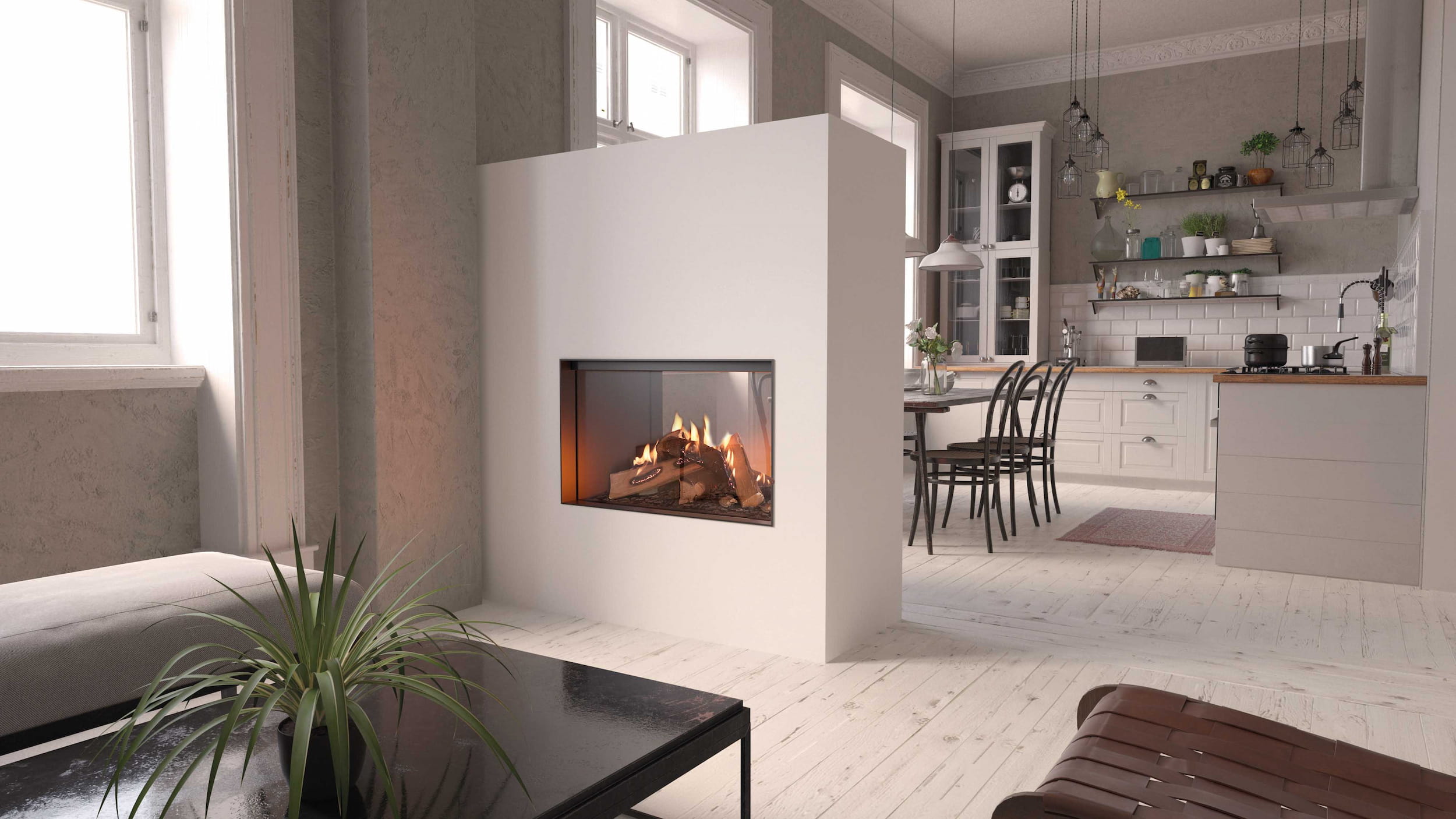 Футеровка выполнена из черного матового листа. Опционально её можно заменить на черную стеклокерамику с зеркальной поверхностью. Управление огнём осуществляется с помощью пульта Д/У. Для подключения необходим коаксиальный дымоход диаметром 130/200 мм. Топка может работать как на магистральном, так и на природном газе. Гарантия — 2 года.