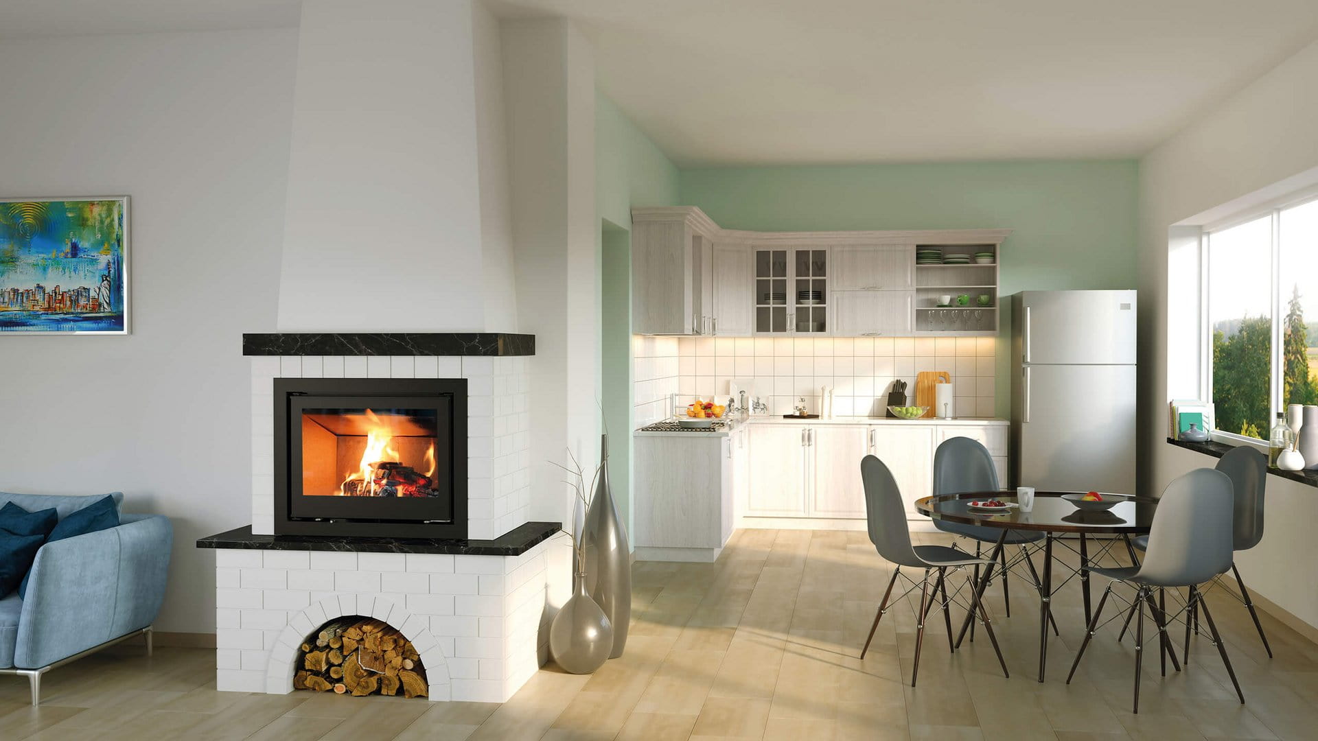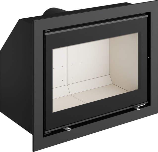 Топочная камера футерована шамотом белого цвета. Модель с режимом подового (безколосникового) горения. Топка обладает всеми современными технологиями горения: вторичный дожиг газов и система "Чистое стекло". Очаг с возможностью притока воздуха извне. Для подключения необходим дымоход диаметром 180 мм.