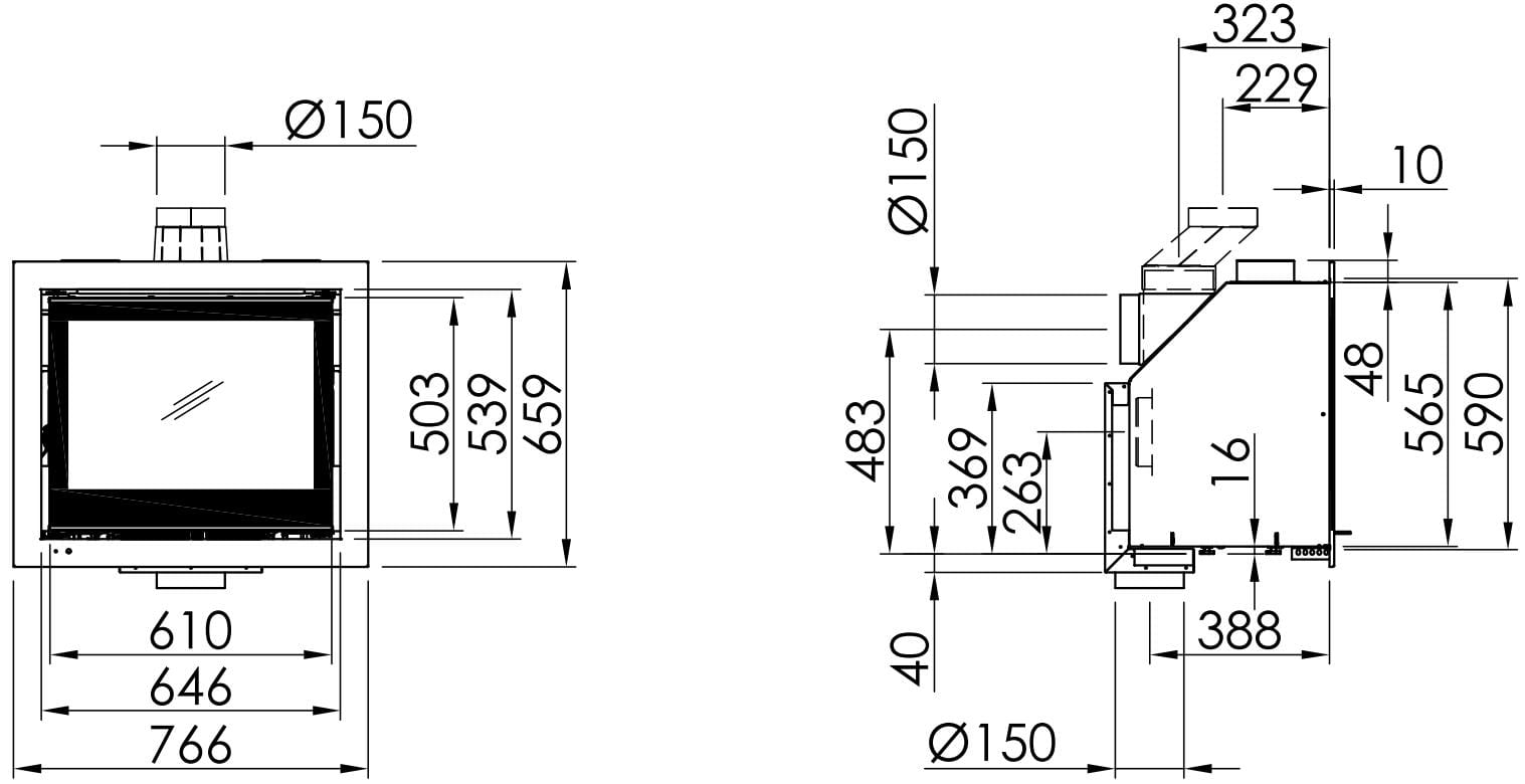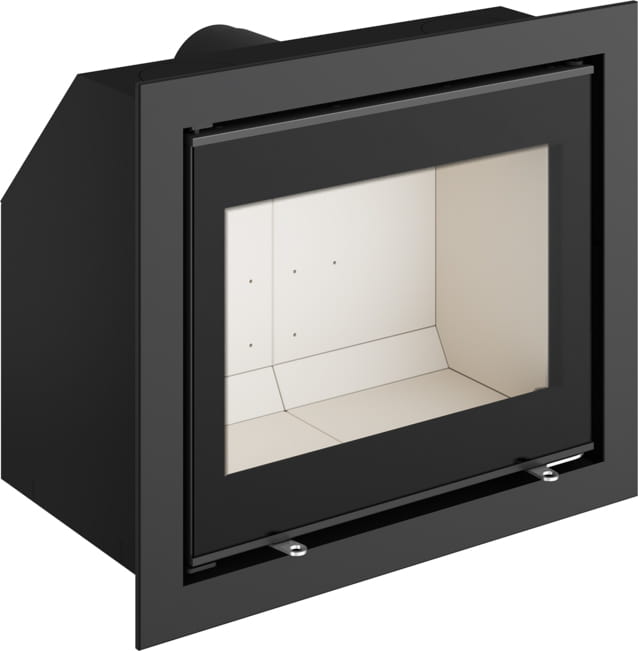 Топочная камера футерована шамотом белого цвета. Модель с режимом подового (безколосникового) горения. Топка обладает всеми современными технологиями горения: вторичный дожиг газов и система "Чистое стекло". Очаг с возможностью притока воздуха извне. Для подключения необходим дымоход диаметром 150 мм.