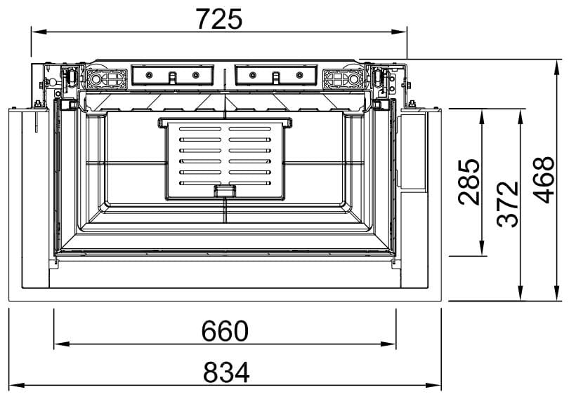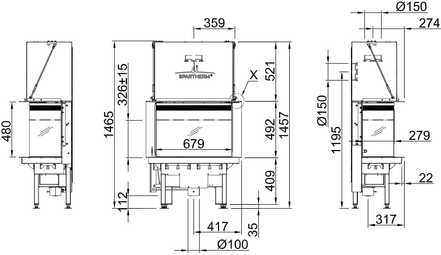 У топки трехстороннее жаропрочное стекло в безрамочном исполнении (отделка Premium). Дверца с подъёмным механизмом, комплектуется 6-сторонней массивной монтажной рамой. Ширина дверцы с фронтальной стороны — 679 мм, с боковых — 279 мм, высота — 480 мм.