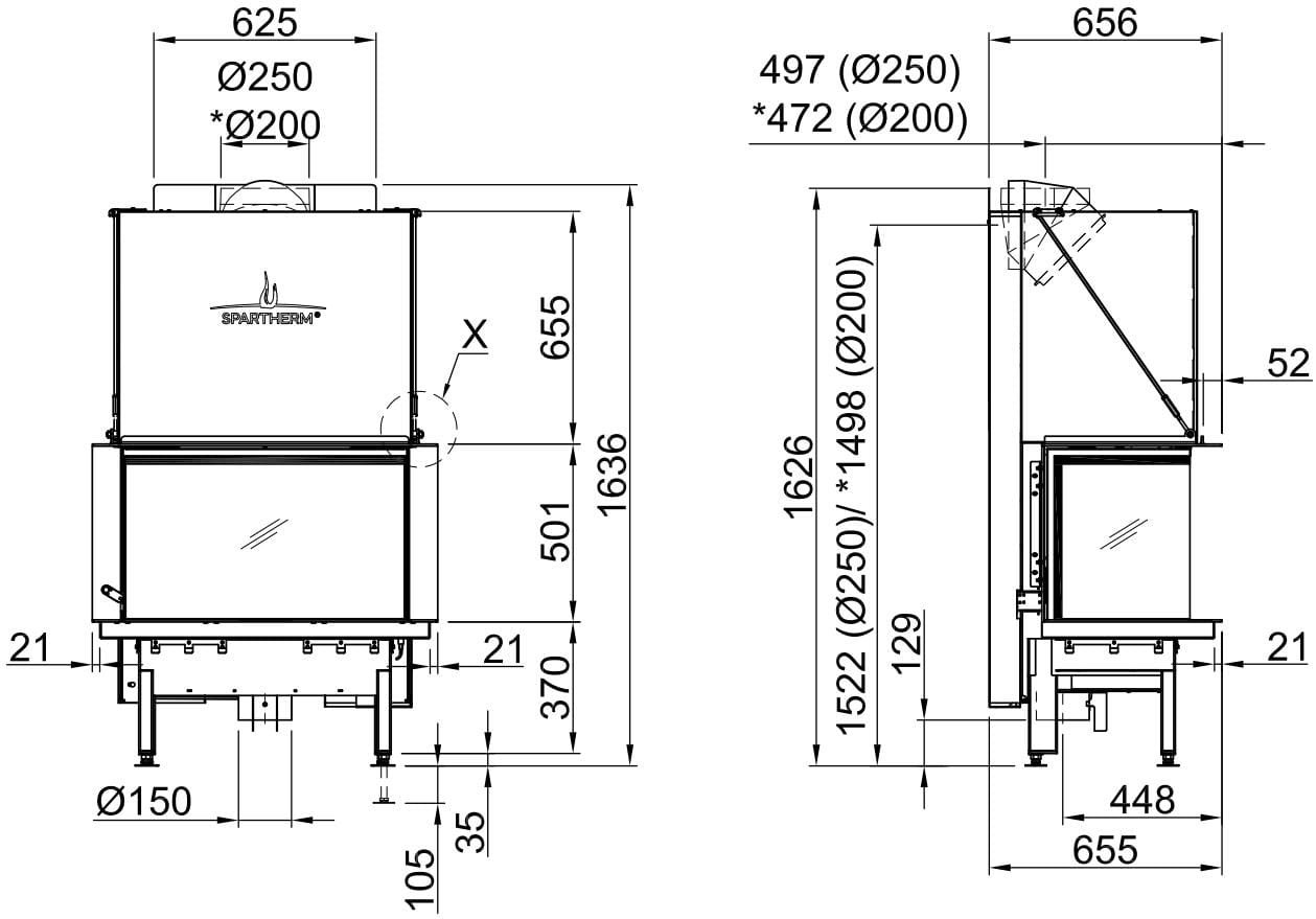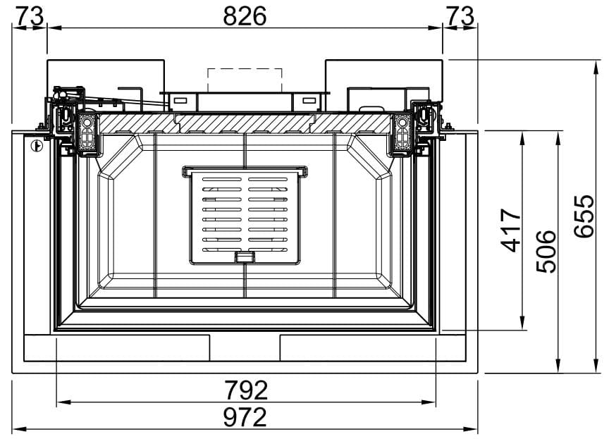 У топки трехстороннее жаропрочное стекло в безрамочном исполнении (отделка Premium). Дверца с подъёмным механизмом, комплектуется 8-сторонней массивной монтажной рамой. Ширина дверцы с фронтальной стороны — 792 мм, с боковых — 417 мм, высота — 501 мм.