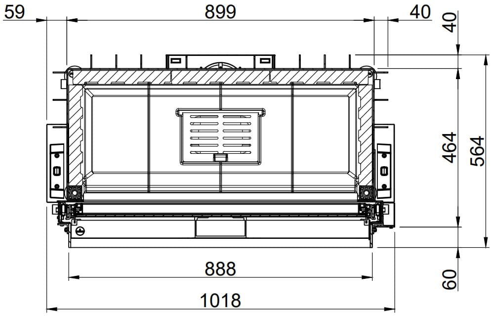 Топочная камера футерована шамотом белого (опционально черного) цвета. Модель оснащена чугунным колосником и зольным ящиком. Топка обладает всеми современными технологиями горения: вторичный дожиг газов и система "Чистое стекло". Очаг с возможностью притока воздуха извне (адаптер в комплекте). Для подключения необходим дымоход диаметром 250 мм.
