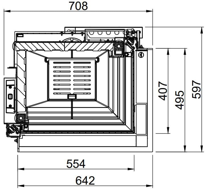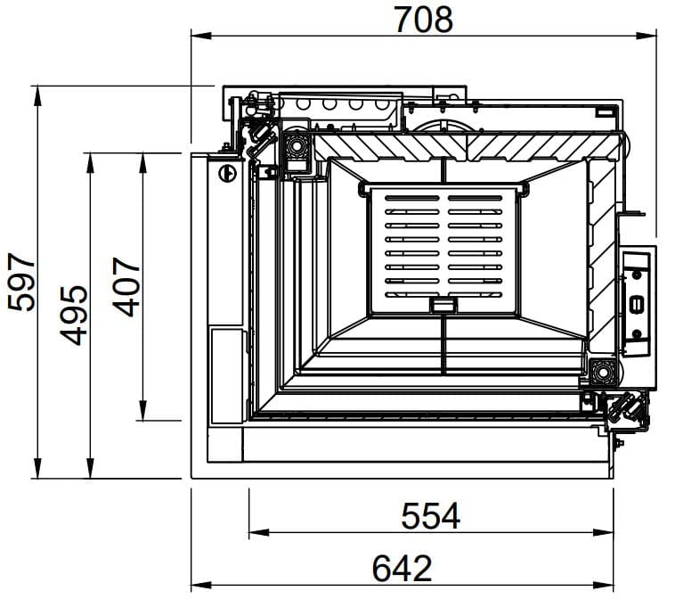 У топки два жаропрочных стекла в безрамочном исполнении (отделка Premium). Дверца с подъёмным механизмом, комплектуется 6-сторонней массивной монтажной рамой. Второе стекло расположена слева (V-2L-55h) или справа (V-2R-55h). Ширина дверцы с фронтальной стороны — 554 мм, с боковой — 407 мм, высота — 501 мм.