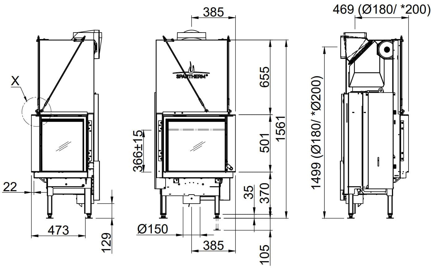 - Varia — максимальное разнообразие форм и размеров: фронтальные модели с подъёмным механизмом или левым/правым открыванием двери; двухсторонние (пристенно-угловые) варианты с обоими способами открывания; трёхсторонние топки с подъёмным механизмом или же модели со сквозным обзором, для встраивания между двумя комнатами. Ширина стекла — до 1200 мм. Макс. мощность в диапазоне 9.1—19.5 кВт.