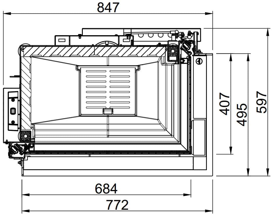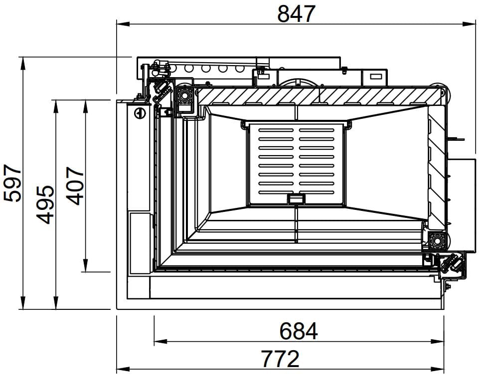 У топки два жаропрочных стекла в безрамочном исполнении (отделка Premium). Дверца с подъёмным механизмом, комплектуется 6-сторонней массивной монтажной рамой. Второе стекло расположена слева (V-2L-68h) или справа (V-2R-68h). Ширина дверцы с фронтальной стороны — 684 мм, с боковой — 407 мм, высота — 501 мм.