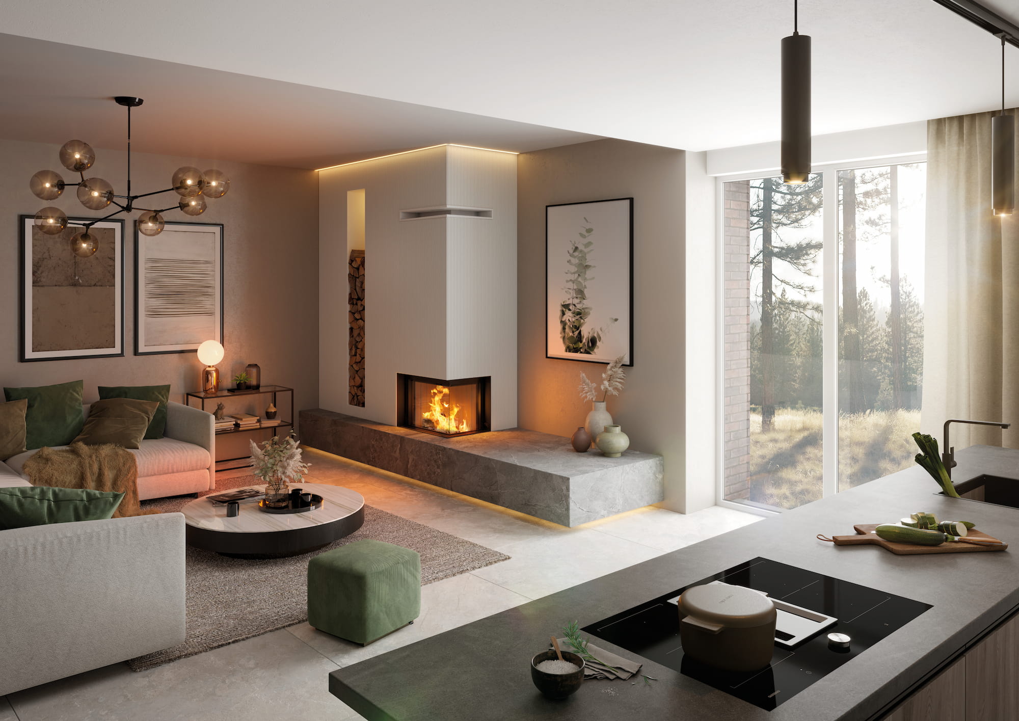 - Varia — максимальное разнообразие форм и размеров: фронтальные модели с подъёмным механизмом или левым/правым открыванием двери; двухсторонние (пристенно-угловые) варианты с обоими способами открывания; трёхсторонние топки с подъёмным механизмом или же модели со сквозным обзором, для встраивания между двумя комнатами. Ширина стекла — до 1200 мм. Макс. мощность в диапазоне 9.1—19.5 кВт.