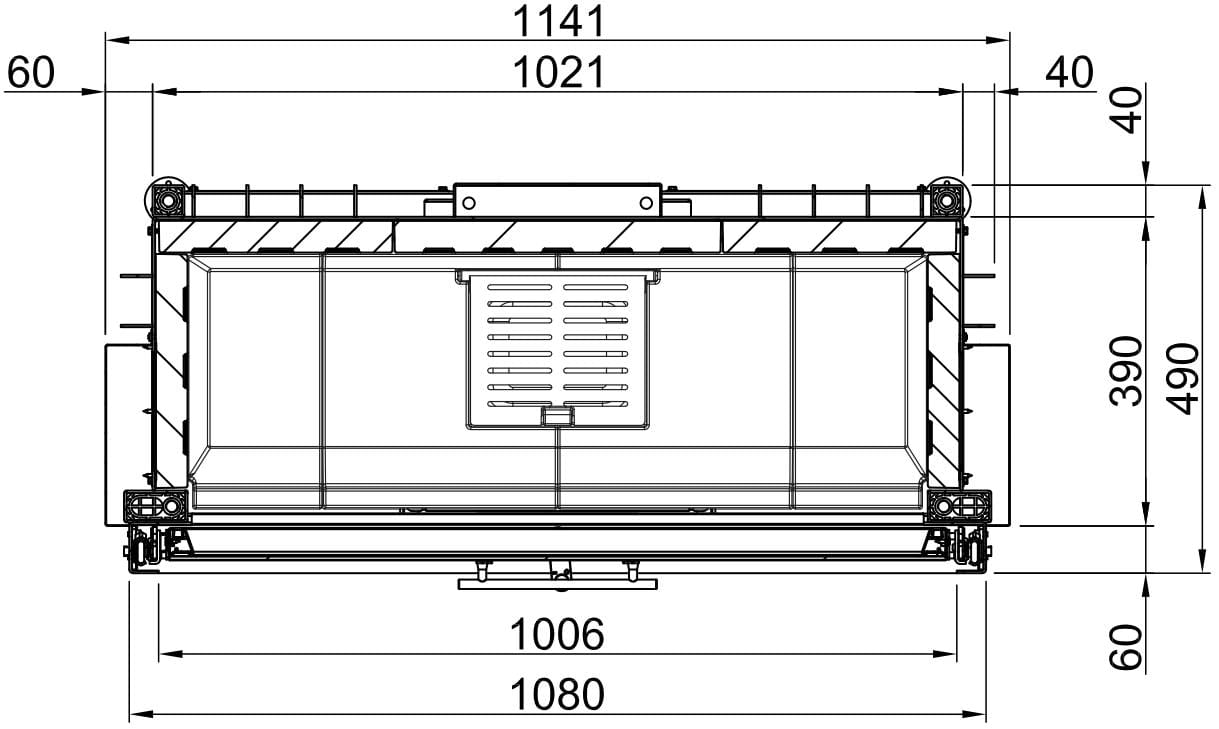 Топочная камера футерована шамотом белого (опционально черного) цвета. Модель оснащена чугунным колосником и зольным ящиком. Топка обладает всеми современными технологиями горения: вторичный дожиг газов и система "Чистое стекло". Очаг с возможностью притока воздуха извне. Для подключения необходим дымоход диаметром 250 мм.