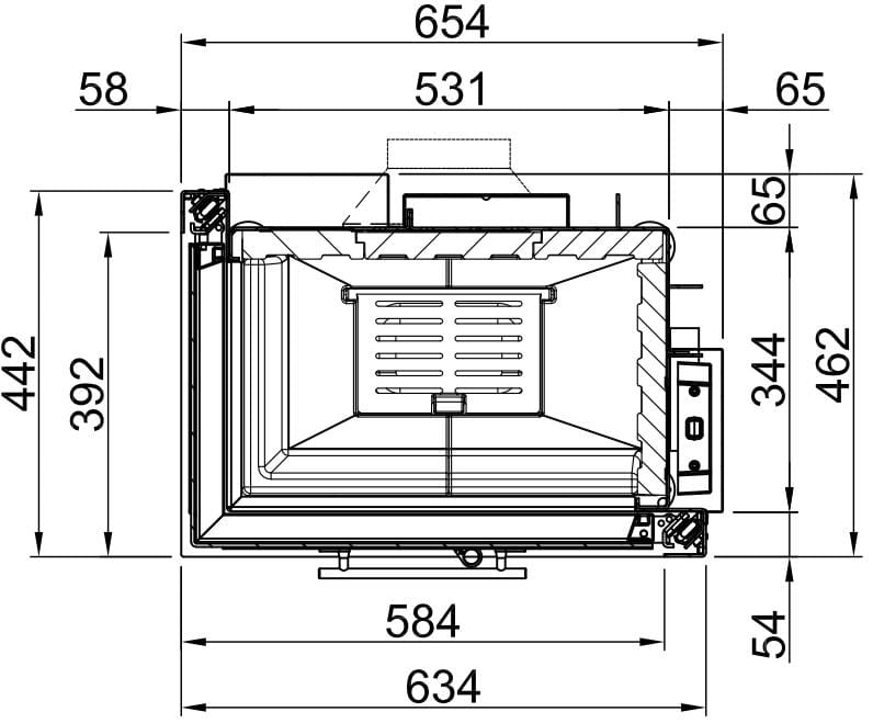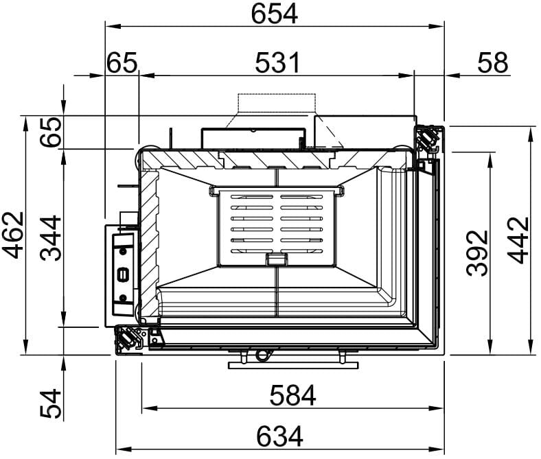Топочная камера футерована шамотом белого (опционально черного) цвета. Модель оснащена чугунным колосником и зольным ящиком. Топка обладает всеми современными технологиями горения: вторичный дожиг газов и система "Чистое стекло". Очаг с возможностью притока воздуха извне. Для подключения необходим дымоход диаметром 180 мм.